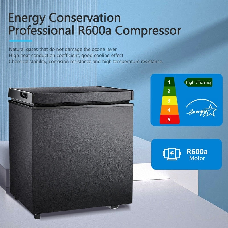 This 1.8 cu. ft. chest freezer is a practical solution for anyone needing extra frozen storage without taking up too much space. With 7 adjustable temperature settings ranging from -7.6°F to 6.8°F, you can easily store everything from seafood and meats to ice cream and frozen meals. The freezer operates quietly at a noise level of 40dB or lower, ensuring a peaceful environment, and uses an energy-efficient R600a compressor for fast cooling and low energy consumption, helping reduce your electricity bill. Despite its compact size, it offers ample storage space with dimensions of 23.62' x 20.47' x 17.13', making it perfect for homes, apartments, or smaller spaces. The hinged door opens smoothly between 45° to 90°, allowing easy, hands-free access. Plus, the manual defrost function helps maintain freshness while saving energy, and the front defrost drain makes cleaning quick and easy. This freezer combines convenience, efficiency, and practicality, making it a great addition to any home.