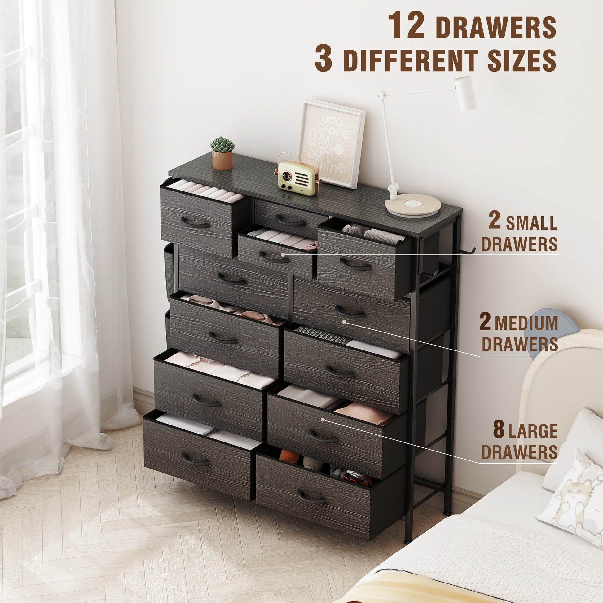 - 【Ample Storage Space】Roomy capacity with 12 deep fabric drawers. 3 different sizes of fabric drawer chests are great for organizing your clothes, blankets, scarves, socks, and others.
