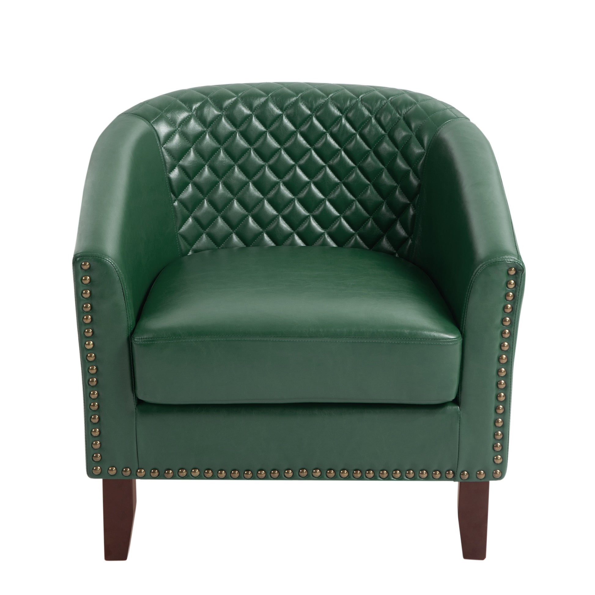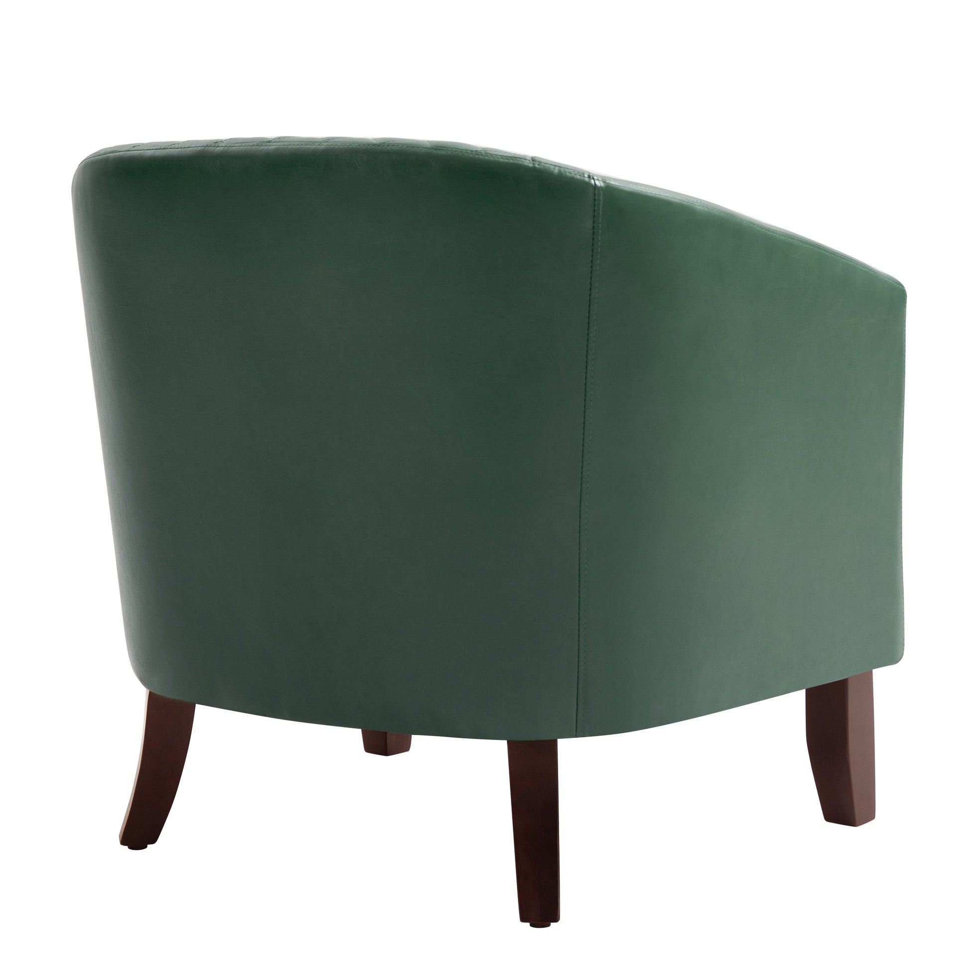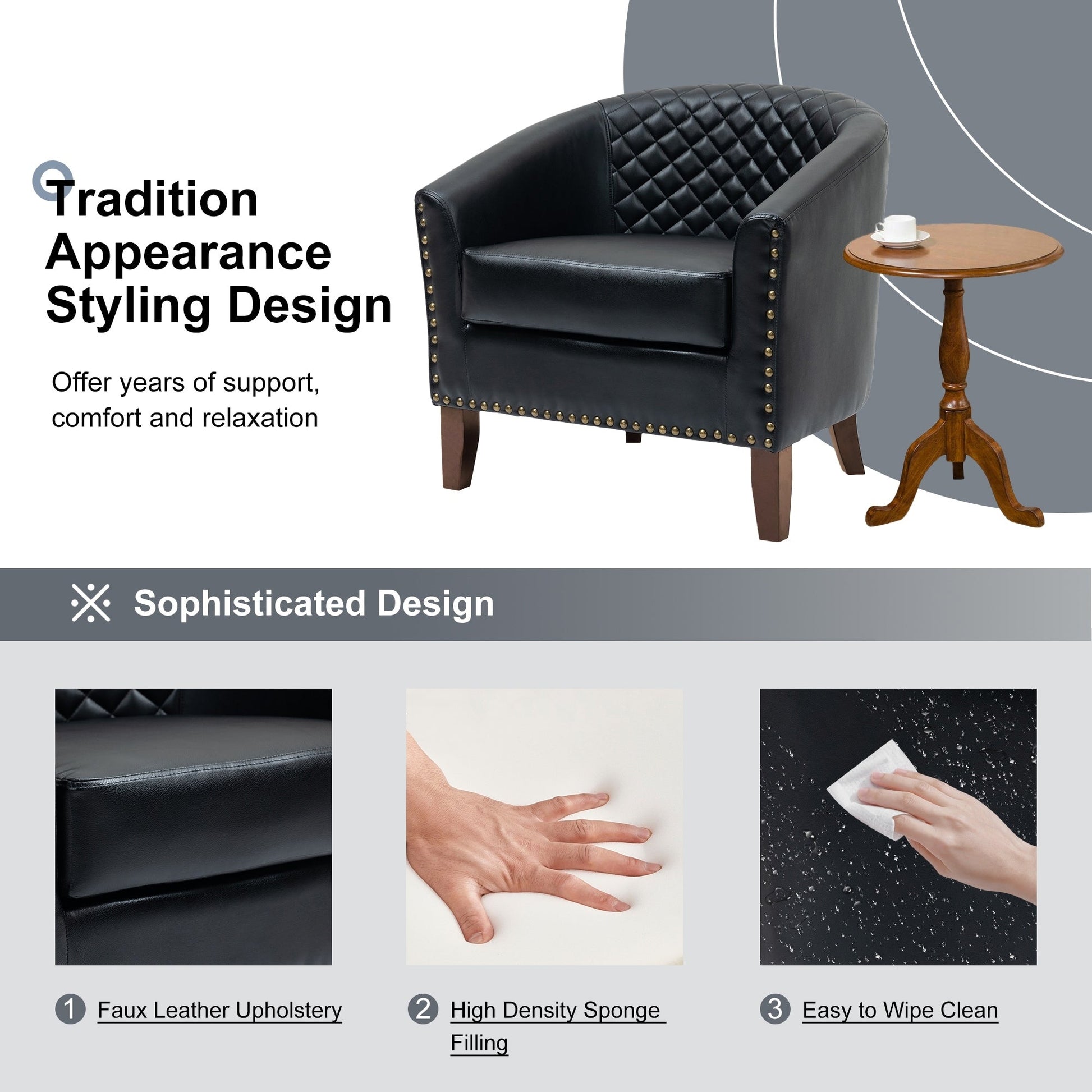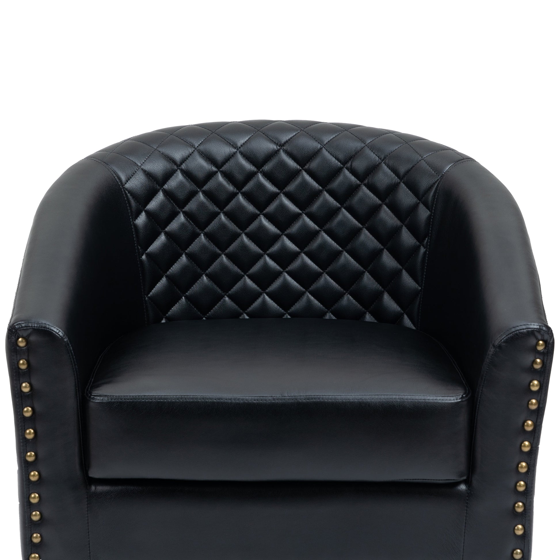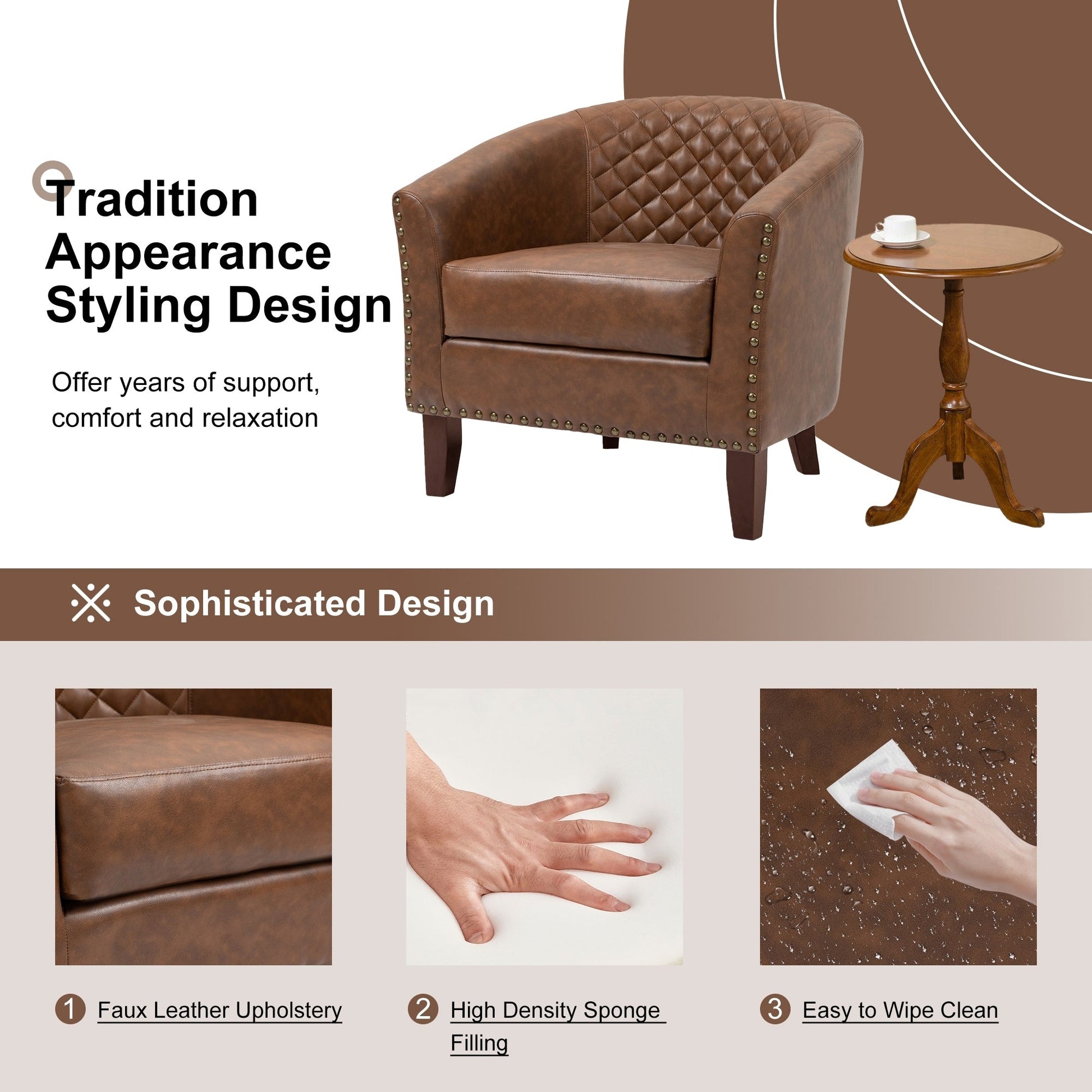 Add a touch of style and texture to any space in your home with the versatile accent barrel chair. Wonderful choice for living rooms, bedrooms, home offices, or cozy nooks, it even doubles as a chic desk chair for all-day support. Feature curved edges, plush foam padding, and premium faux leather upholstery, it offers both relaxation and elegance. The tufted backrest adds a refined touch, sturdy armrests provide ample support and safety. A stylish and functional addition to your home.