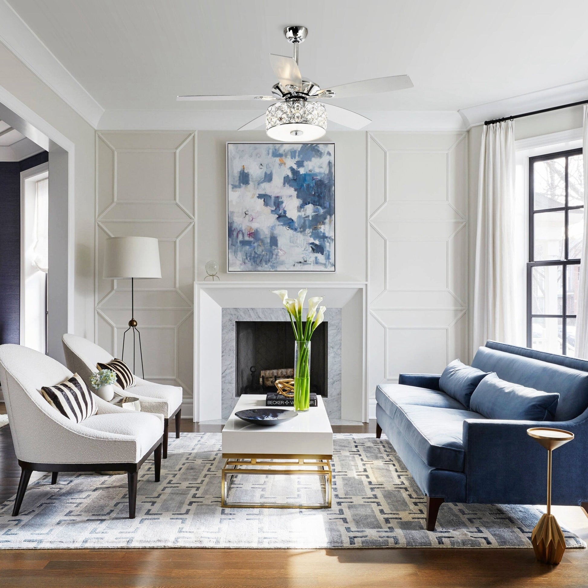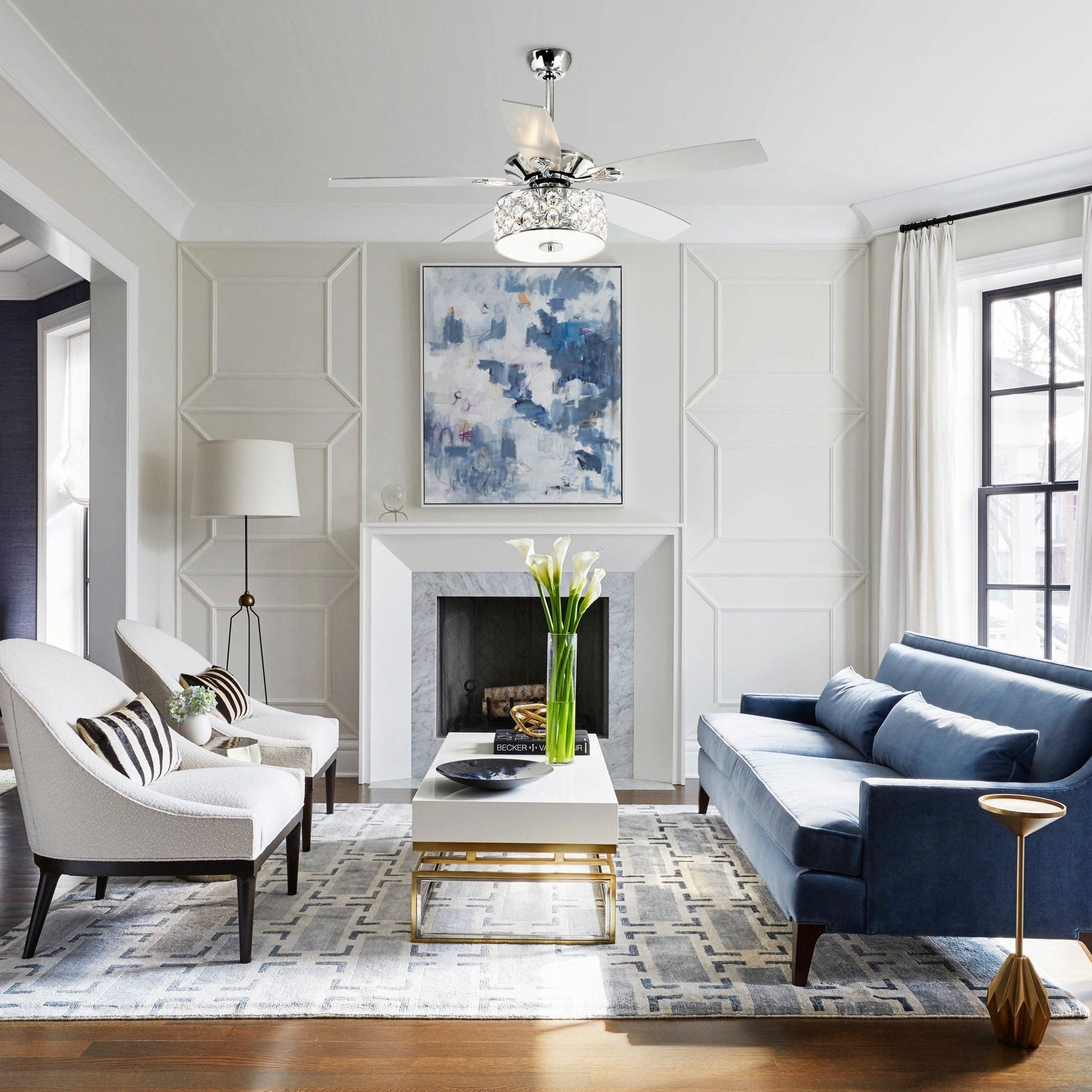 Bring a touch of modern sophistication to your living space with this 52' Modern 4-Light Chandelier Crystal Ceiling Fan with Remote. The chrome-finished metal frame and silver-stained wooden blades provide a sleek and updated look that is perfect for any room in your home. Enjoy the benefits of a reversible motor with three speeds that can be used in the winter to save energy. A handheld remote makes it easy to turn the light on and off and adjust the fan speed to your liking.