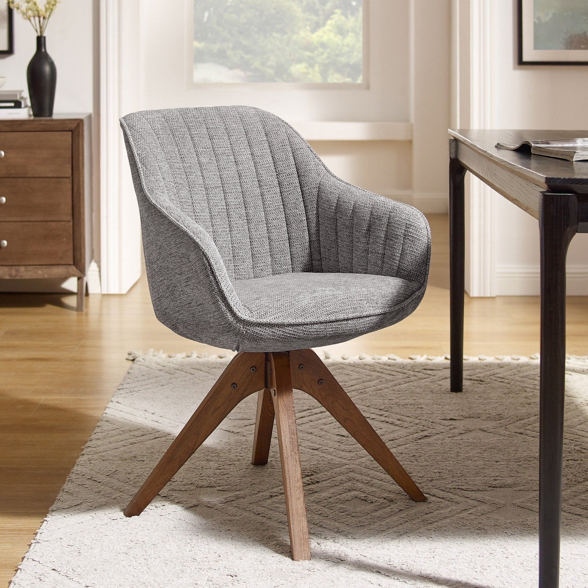 Upgrade your home office with this stylish swivel arm accent chair. The mid-century modern design features a molded seat with sloping arms and channel tufting along the back and arms. The comfortable cushioned seat and tilt backrest are upholstered in your choice of fabric or faux leather. The splayed solid beech wood legs are finished with a walnut lacquer and extend outward for a retro look. The chair also swivels 360 degrees for added functionality.