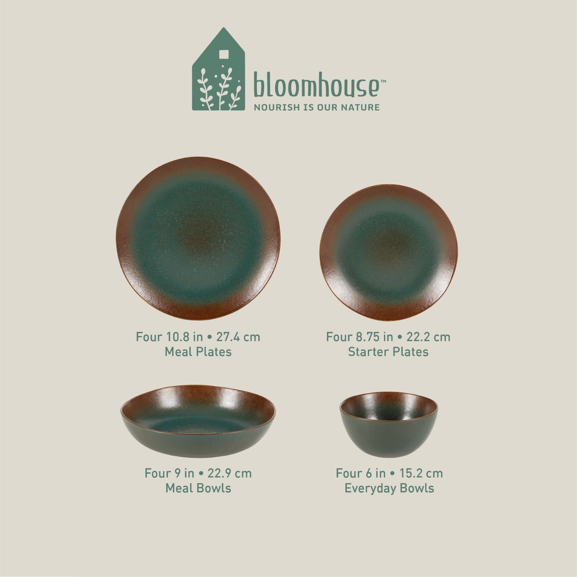 * This set includes four 11-inch meal plates, four 8-inch starter plates, four 6-inch everyday bowls, and four 9-inch meal bowls.