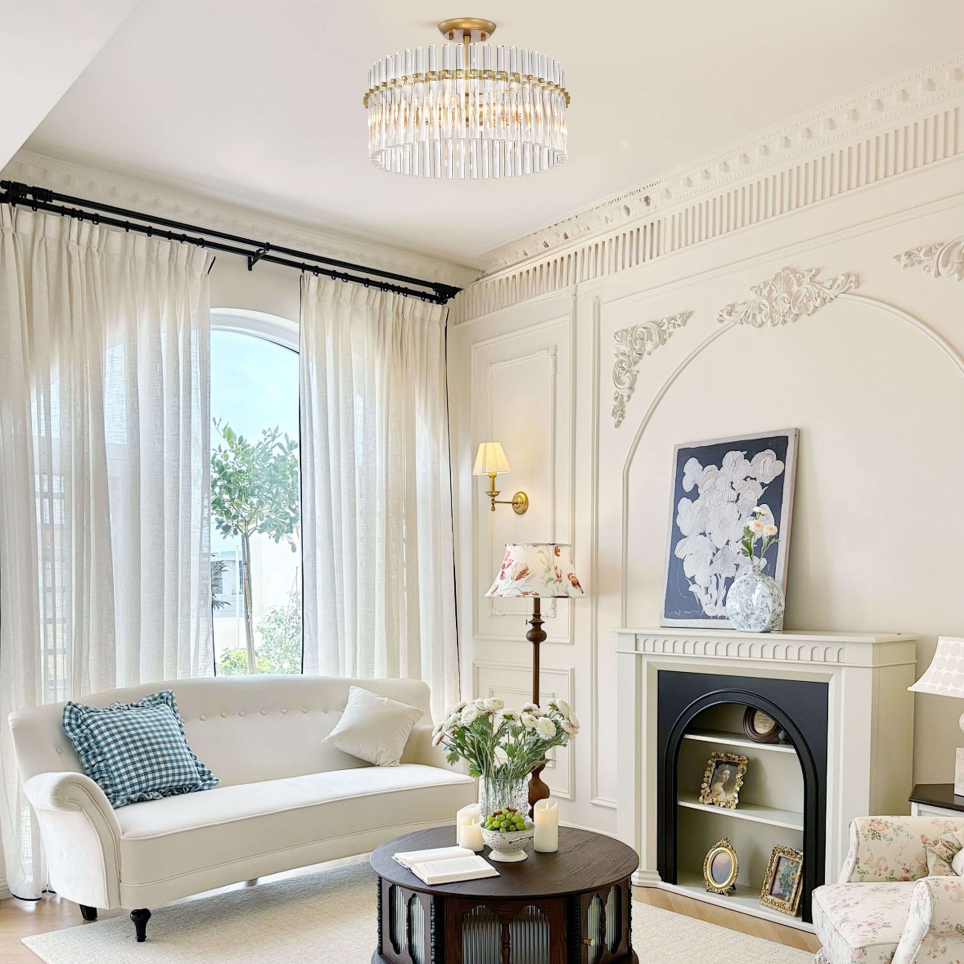 This 4-light flush mount fuses modern style with luxurious elements. The round canopy and ring are made from metal with a brushed brass finish. A ring supports the crystal glass rods that adds a touch of glam to your living space. The four 60W candelabra style bulbs (sold separately) are barely visible and cast a light that is artfully reflected off the shimmering crystals. This flush mount is LED compatible and is rated for both dry and damp locations, so you're able to install it just about anywhere.
