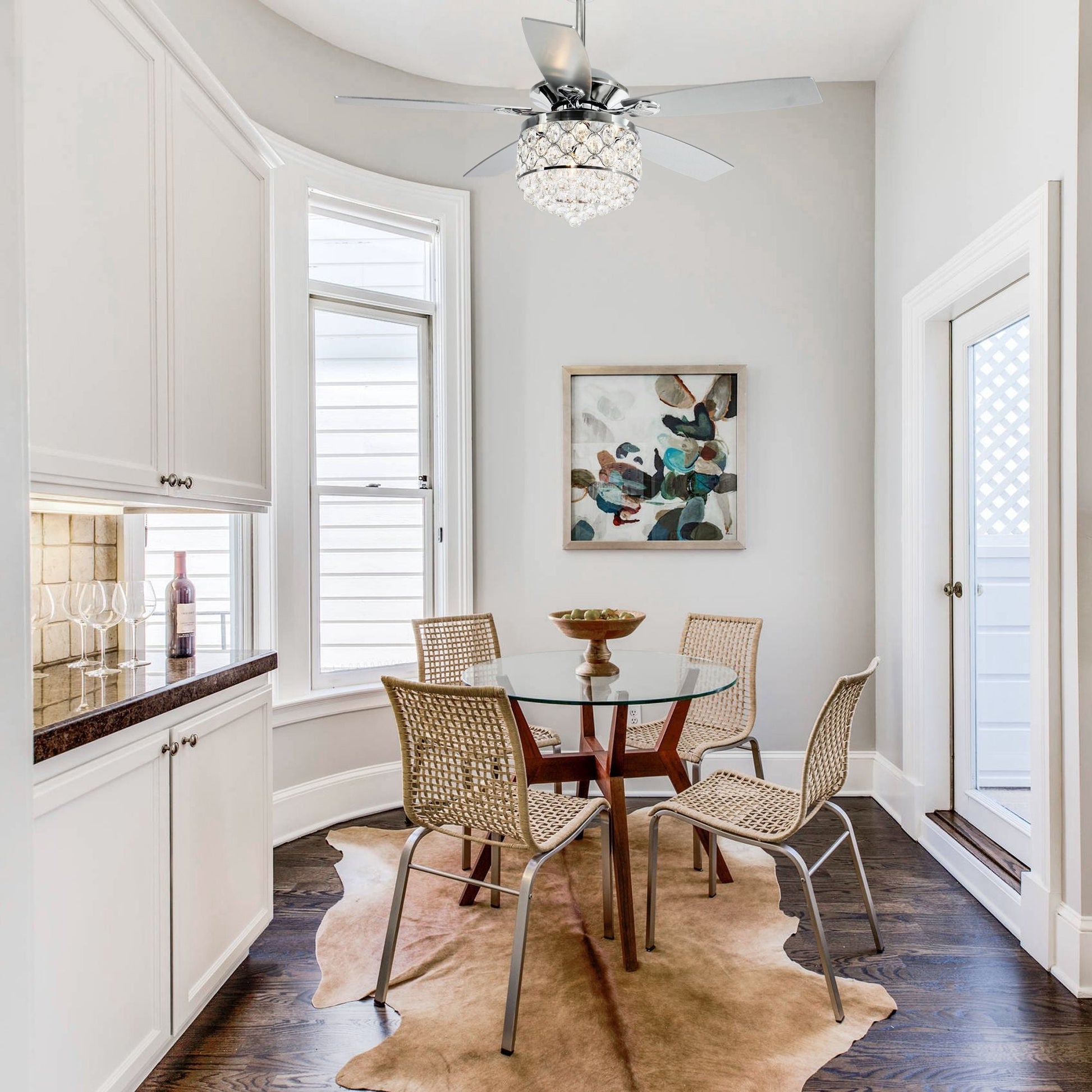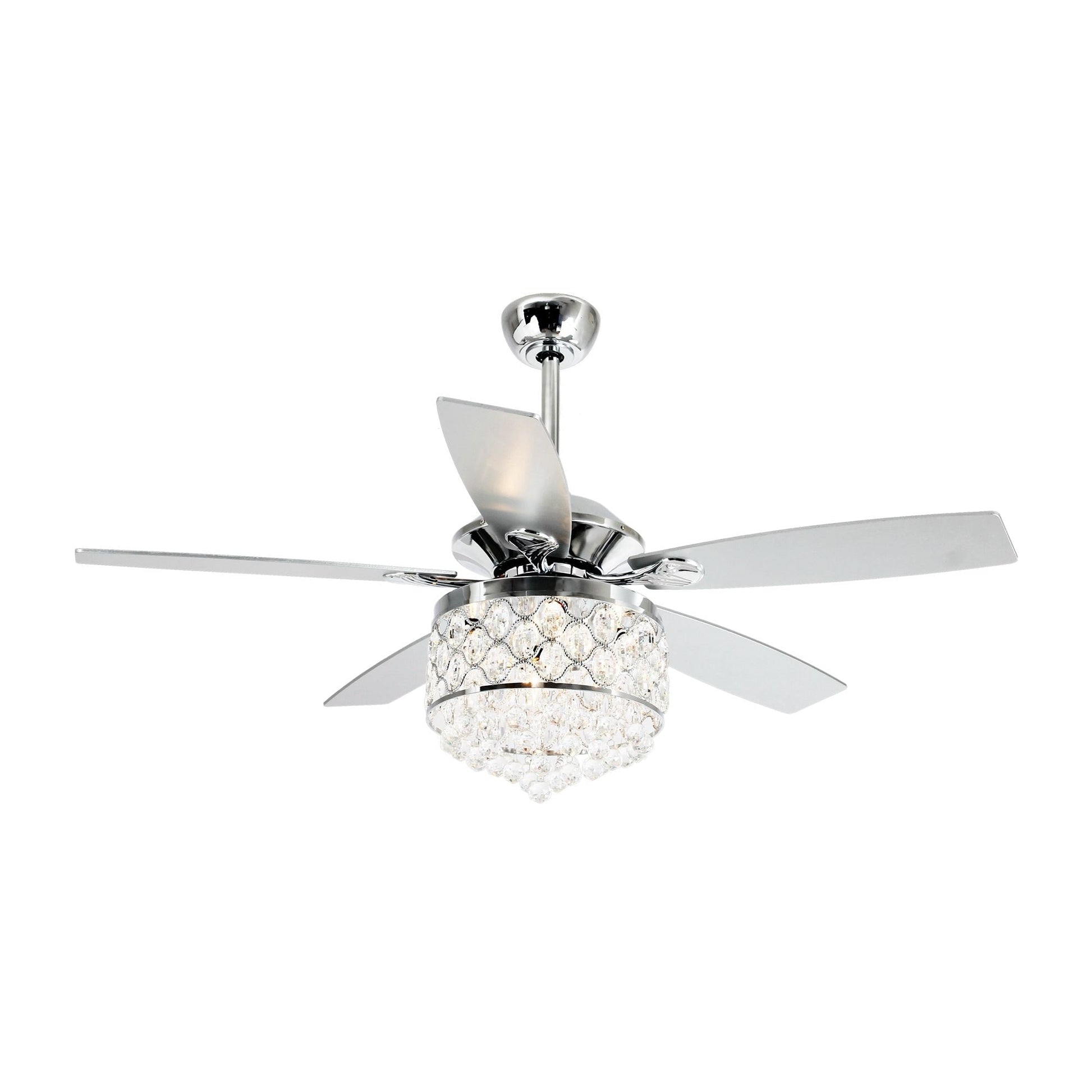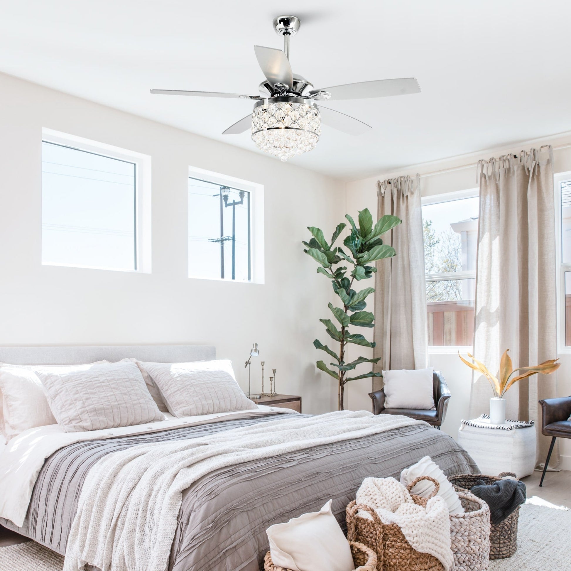 Enhance your home's elegance and comfort with this stunning Chrome/Crystal 4-light Chandelier Ceiling Fan. With its shimmering crystal embellishments, this 52-inch fandelier features a modern design that adds a touch of sophistication to any space. The remote-controlled, 3-speed reversible motor provides year-round comfort, and the fan's reversible switch helps to reduce energy costs.