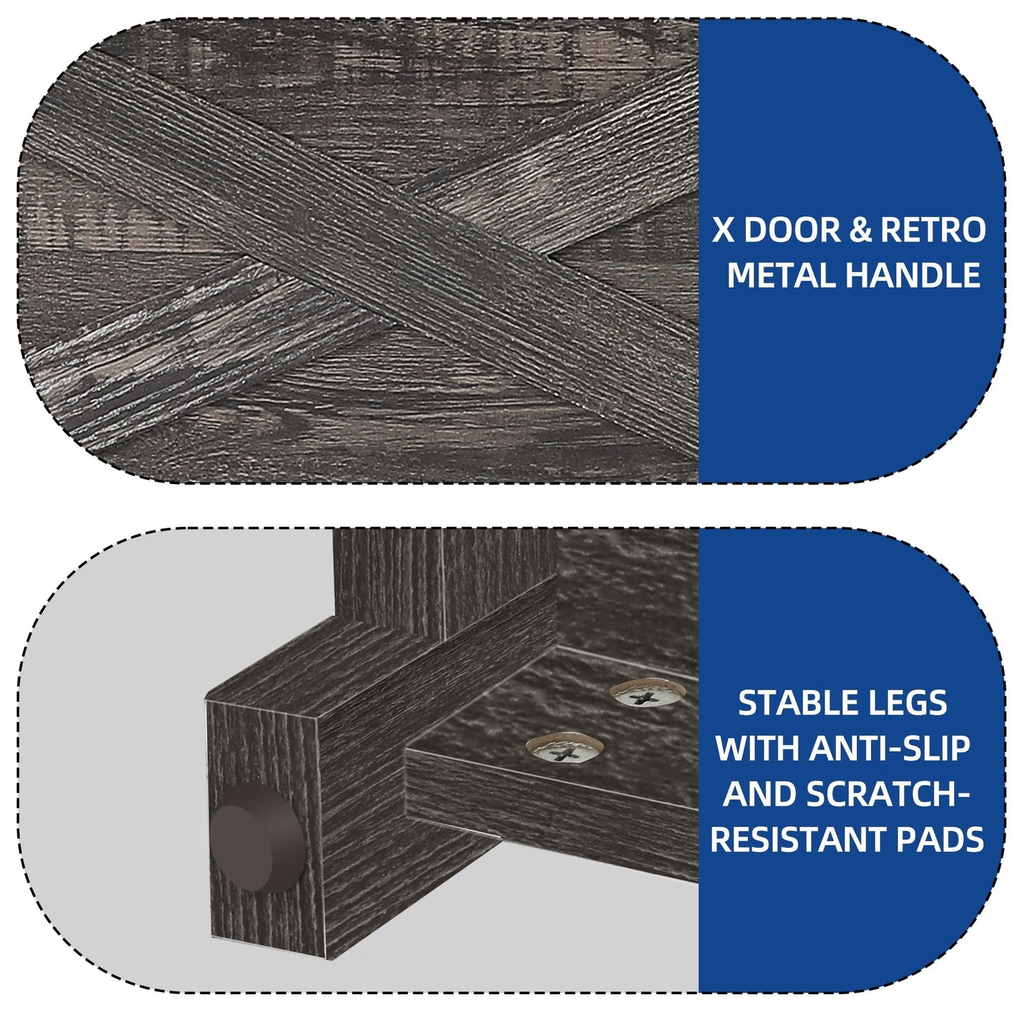 - 1. Double X Design: Classic X design on both sides upgraded the decoration style. Easy steel bar handles hinge doors put things in and out conveniently without wobbling or scraping