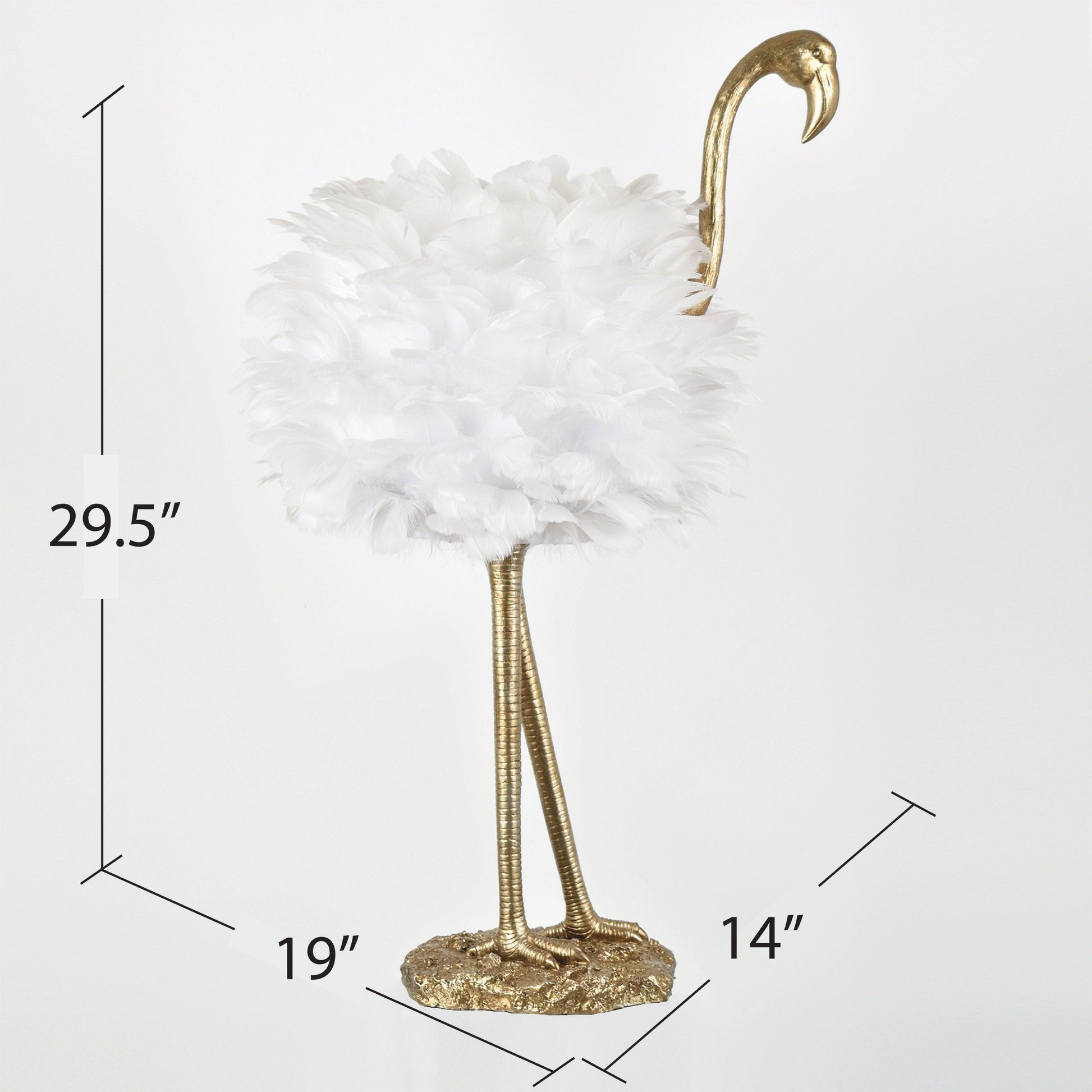 Add a tropical touch to your home decor with this stunning 30.5'H Gold & White Flamingo Table Lamp. Made from textured gold finish resin, this lamp features a long-necked flamingo perched on a rock-like stand with a cluster of feathers in place of a shade. The 60W bulb inside the feathers diffuses a warm glow, making it perfect for your living room coffee table or entryway console table. This lamp stands at 30.5' tall and comes with a power switch on the cord for easy access. Assembly is easy with the included hardware.