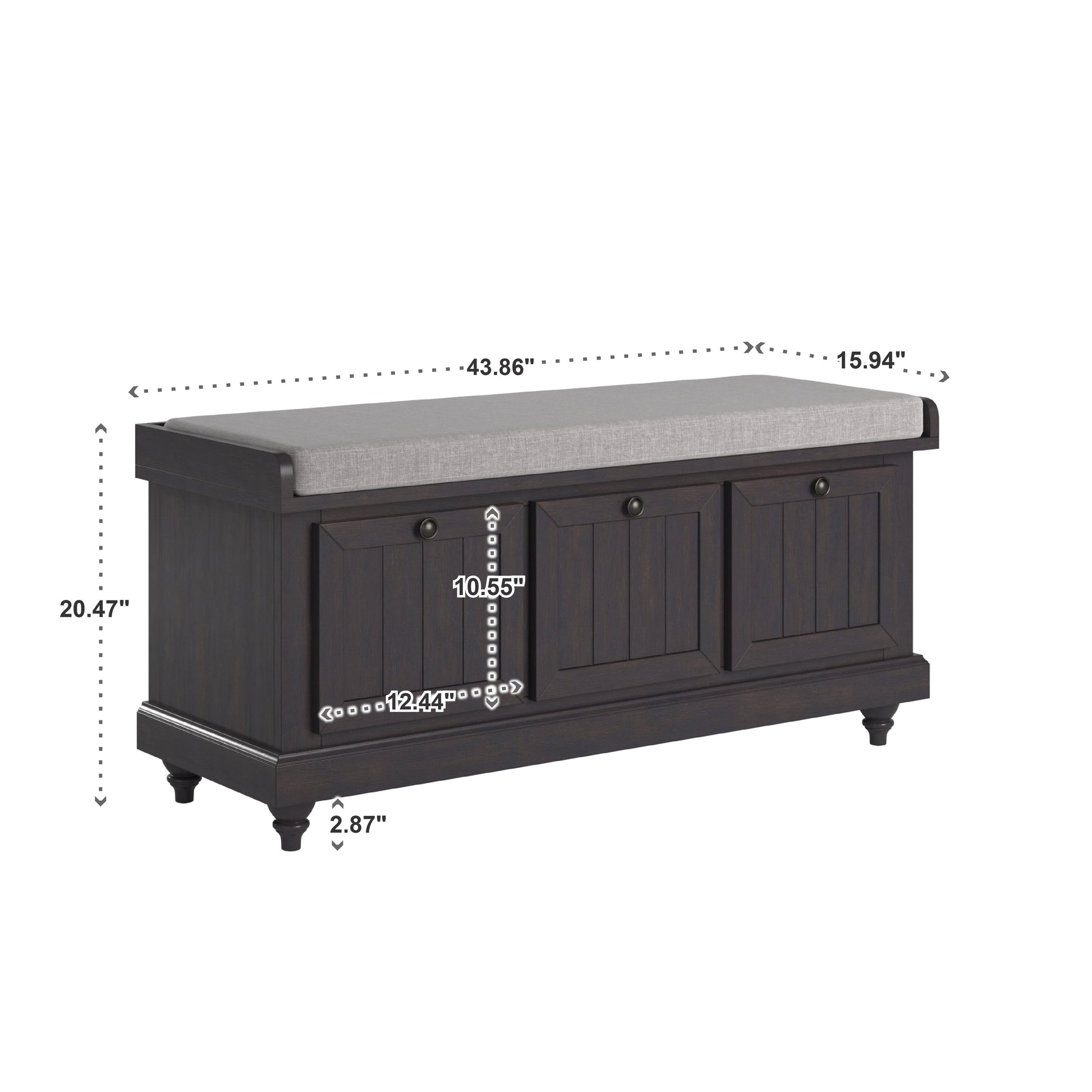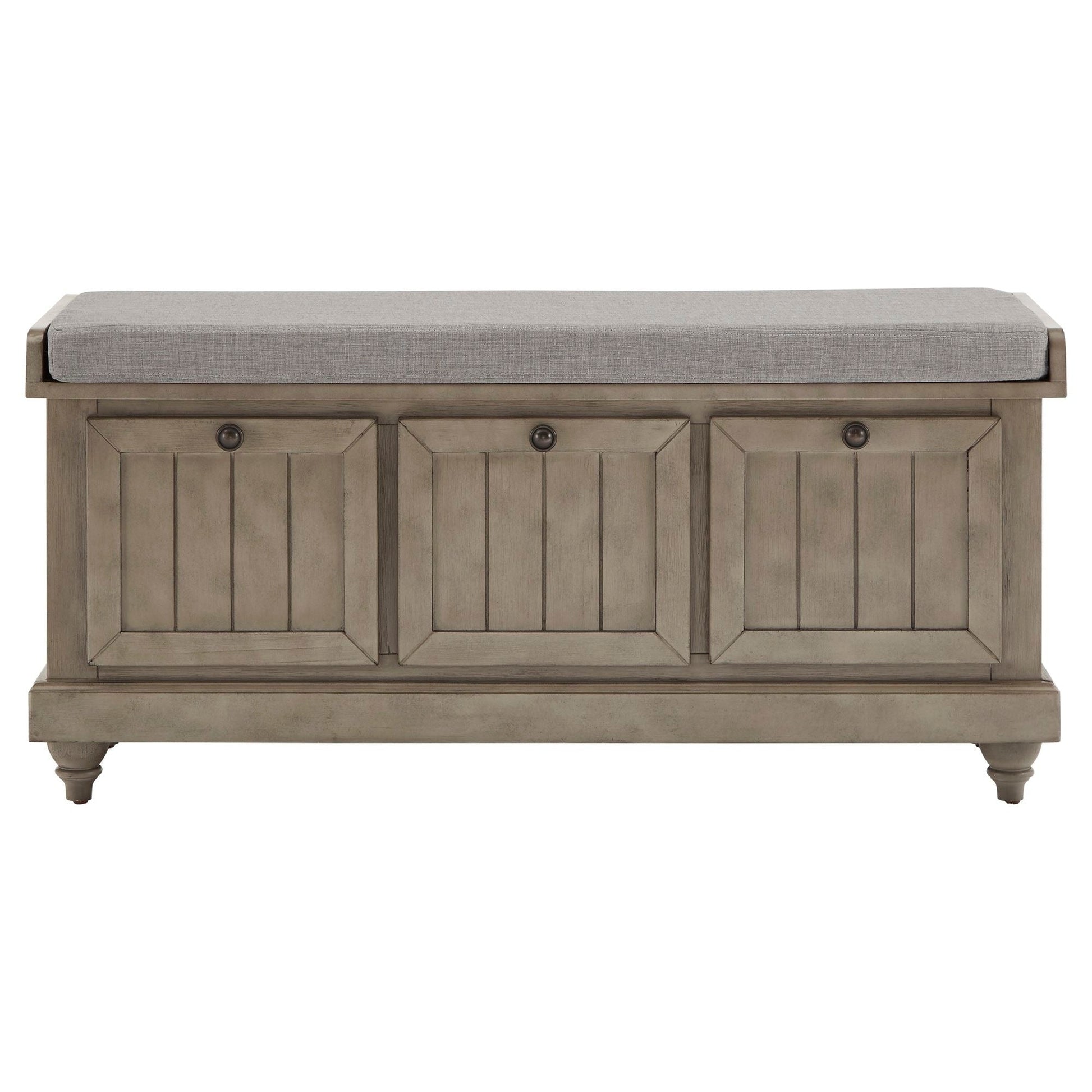 The iNSPIRE Q Granger storage bench provides your entry way with charming style and function. This bench features a soft, beige, or grey, upholstered seat cushion that offers up a comfortable spot to put on or remove shoes while entering or leaving the house, while the top lifts to reveal an interior storage compartment which serves as the perfect spot to tuck away shoes and other accessories from plain sight. The front of the bench showcases the appearance of wood paneled cupboards that accent a farmhouse or rustic setting perfectly. Choose from various finishes to best fit your home's personal style.