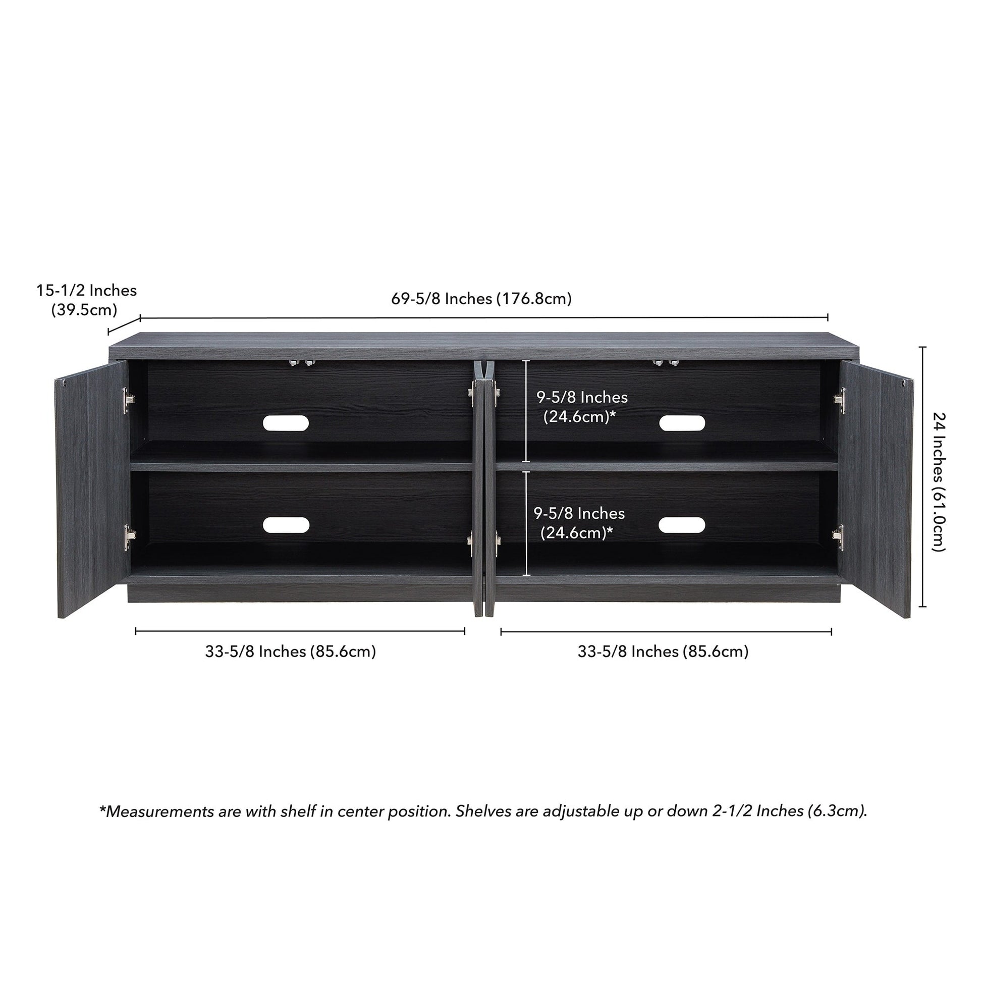 - Features four doors with enclosed cabinets and 4 shelves for ample storage.