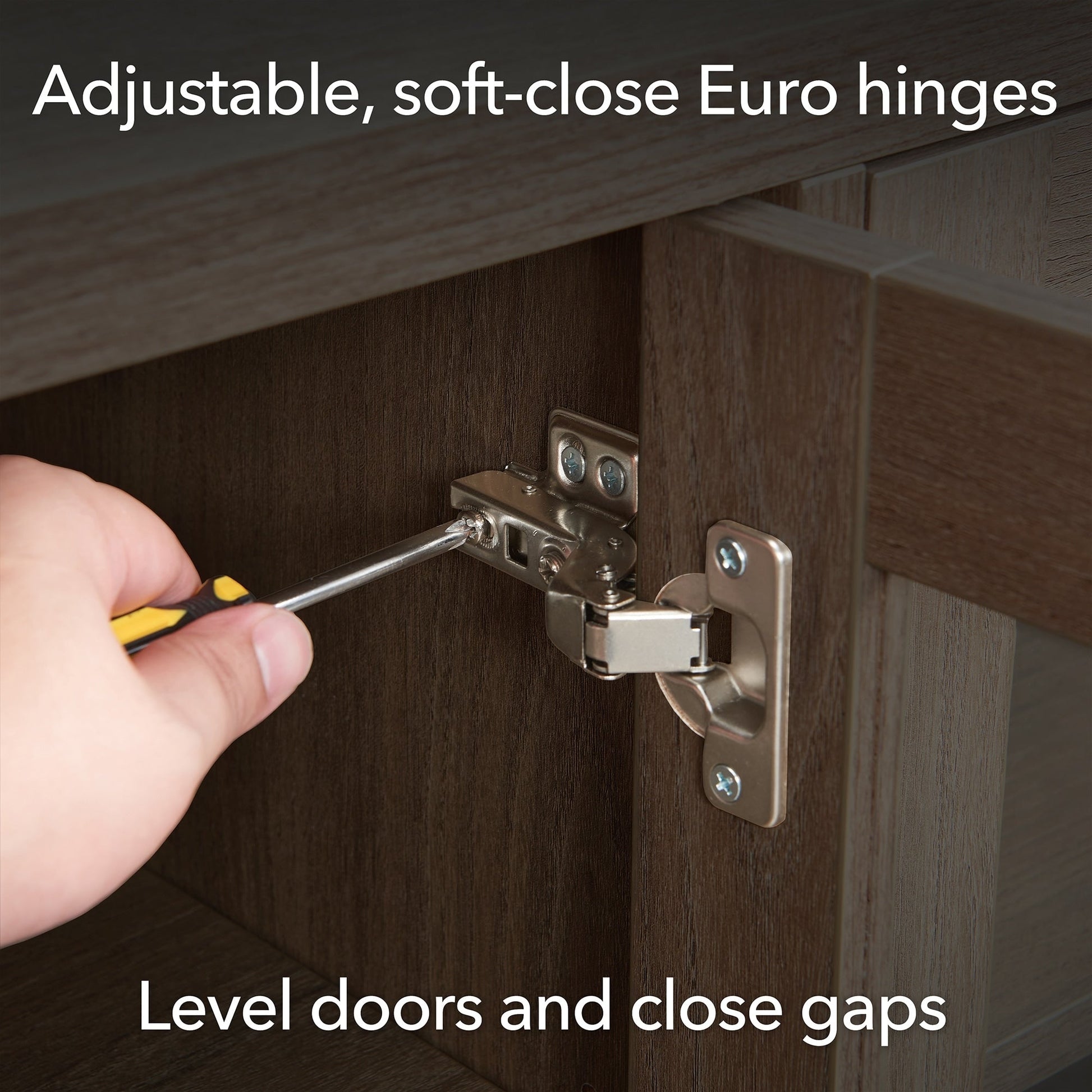 On-trend texture and design combine in this transitional TV stand. With a wood grain finish and textured doors, this piece is sure to be a statement in your living room, den, or game room. The plinth base gives an illusion of a seamless transition from your floor, as if it was always meant to be there. The modern contemporary design of the stand features 4 fully enclosed doors with 4 inner shelves, allowing for ample storage for your devices, games, books, and more.