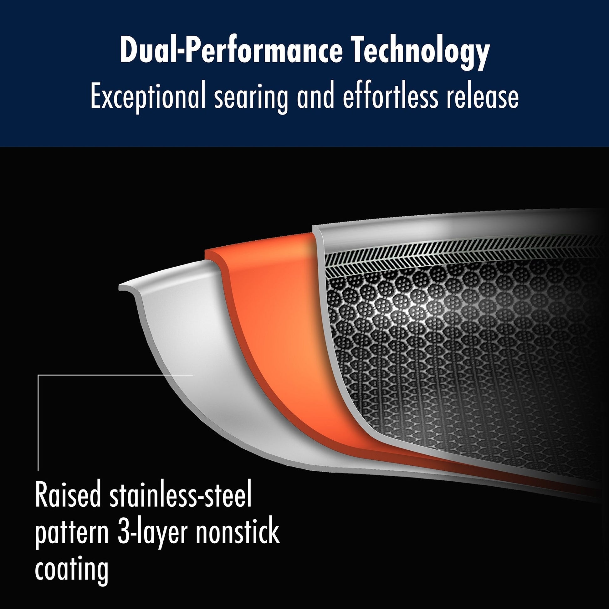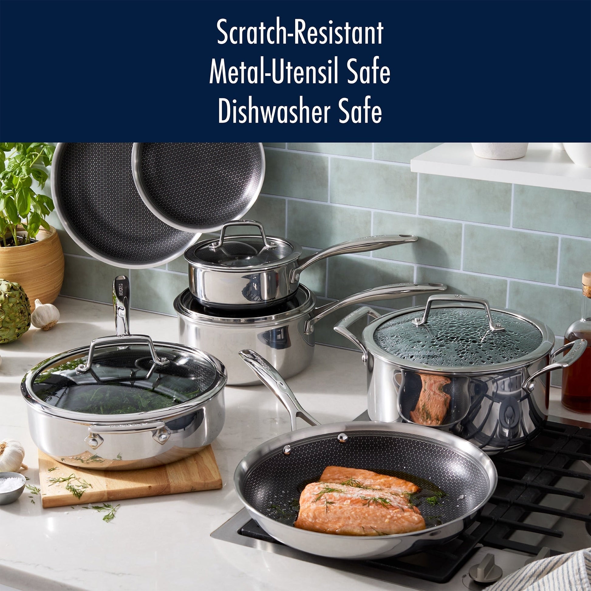 Brown and sear without fear, while enjoying easy release and cleanup with HENCKELS Paradigm hybrid nonstick cookware. This fry pan set features 3 go-to pans for everyday cooking. Scramble eggs in the 8-inch pan, sear meat and sauté vegetables in the 10-inch pan, and cook for a crowd in the 11-inch pan. A raised stainless-steel pattern and 3-layer nonstick inlay combine to deliver the versatility and durability of stainless steel with the convenience of nonstick. The innovative coating and heavy-duty, tri-ply stainless steel construction ensures exceptional performance whether you're browning your-pick-of-proteins or whipping up light-as-air, fluffy omelets. Chef-friendly features include an ergonomic, stay-cool V-shape handle with hanging loop for handy storage, and a flared rim for mess-free pouring. Oven-safe and compatible with all stovetops, you can sear on the stovetop then seamlessly transfer it to the oven. Dishwasher safe, HENCKELS Paradigm is easy to clean, making this simple-to-use cookware a pleasure to cook with.