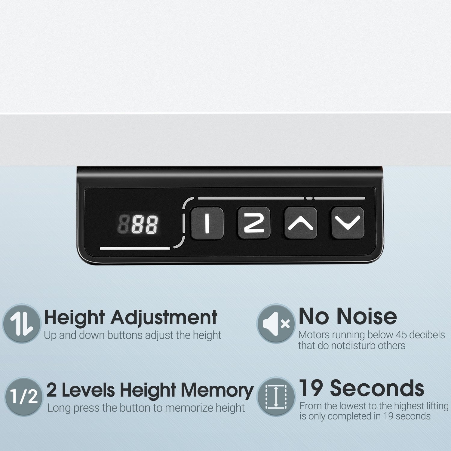 - Height adjustable from 28.75 to 48 inches with 2-position memory function