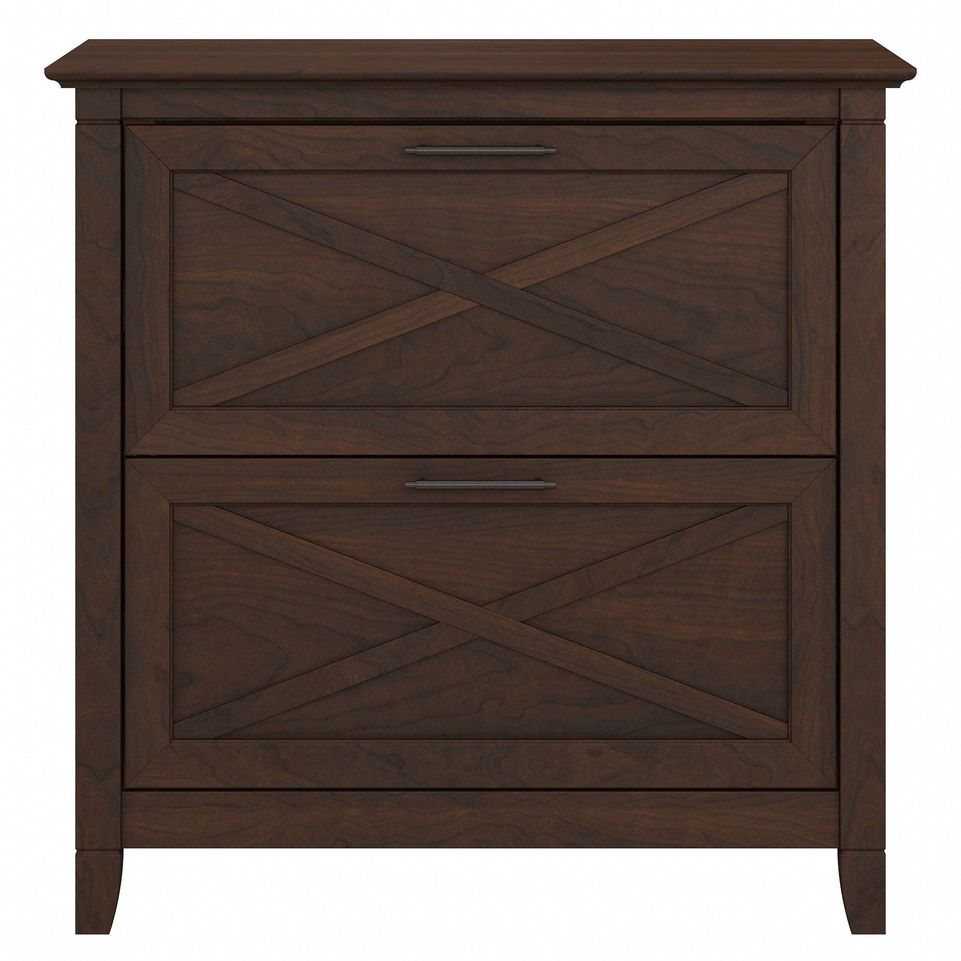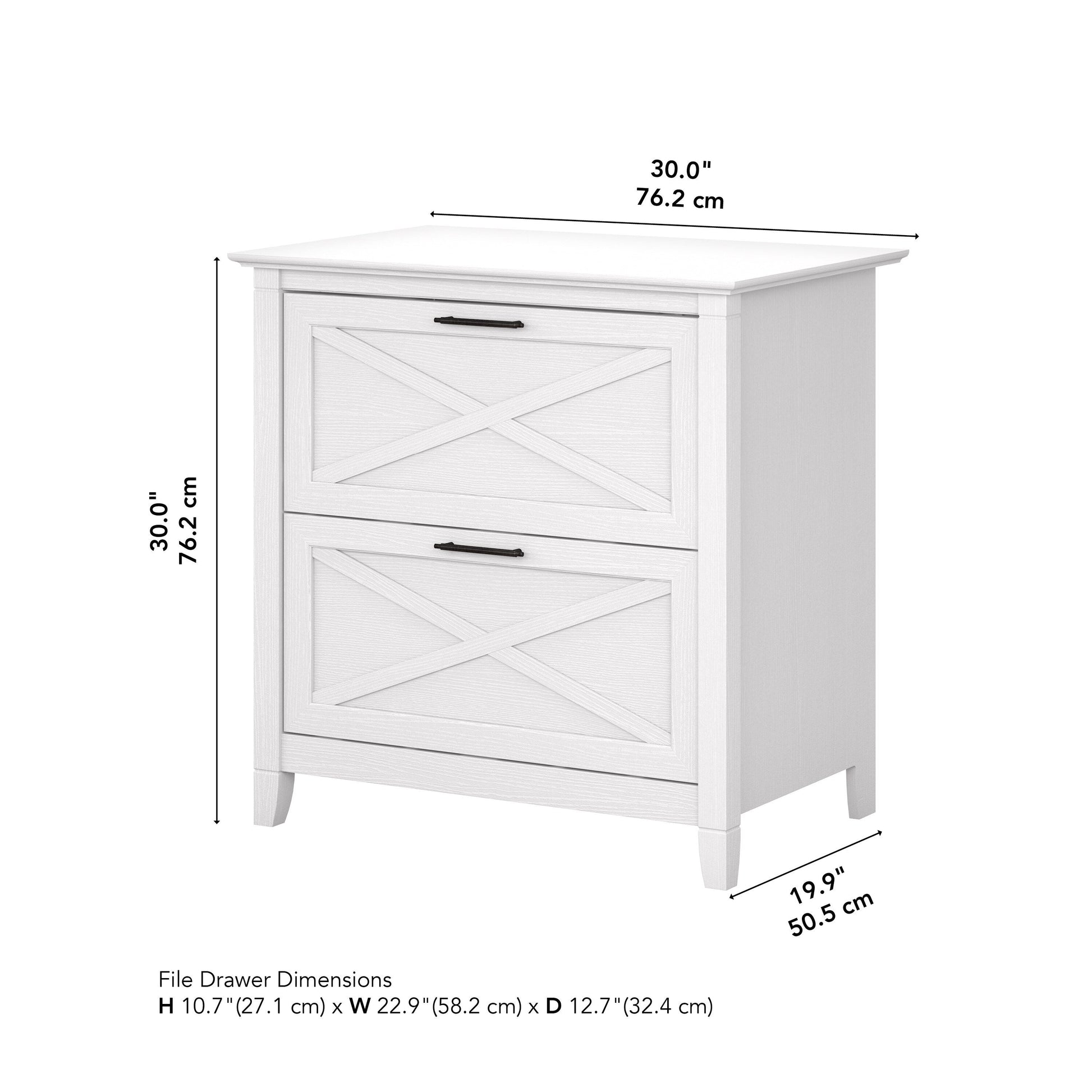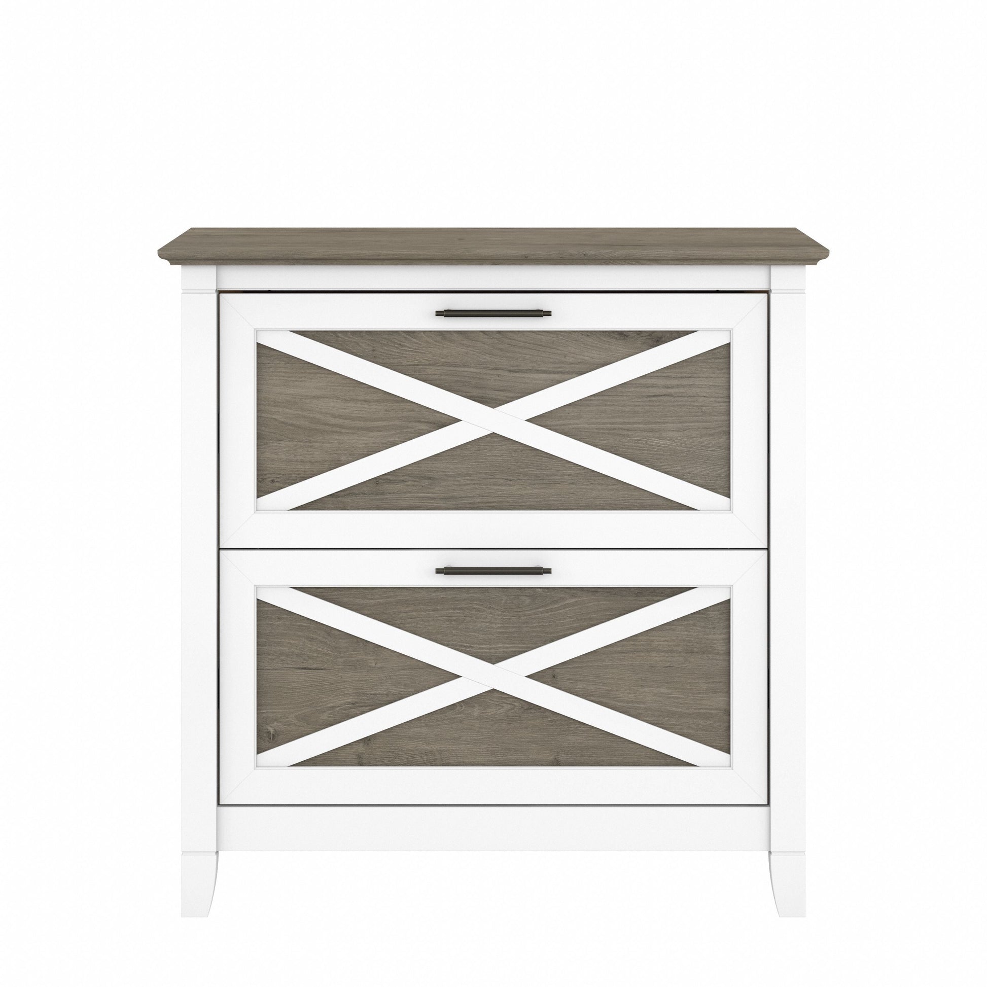 A natural fit for homes that embrace coastal and farmhouse decor, the Bush Furniture Key West 2 Drawer Lateral File Cabinet is perfect for organizing paperwork in virtually any room. Two file drawers open on smooth full-extension ball bearing slides for an easy reach to legal and letter size documents. A unique X pattern accent on the drawer panels creates a relaxed style supported by a sturdy and attractive post leg design. This 30W x 20D x 30H lateral filing cabinet matches the height of any Key West Desk (sold separately) to create an extended work surface when placed side by side. Choose from a variety of casual finish options to find the perfect look for your space. The Key West Collection offers a wide variety of farmhouse furniture that makes building a complete home office or living room ensemble a breeze. This 2 drawer filing cabinet is tested to meet ANSI/SOHO quality standards for safety and performance and is backed by the Bush Furniture 1 Year Manufacturer's Warranty. See the full collection for coordinating items available.