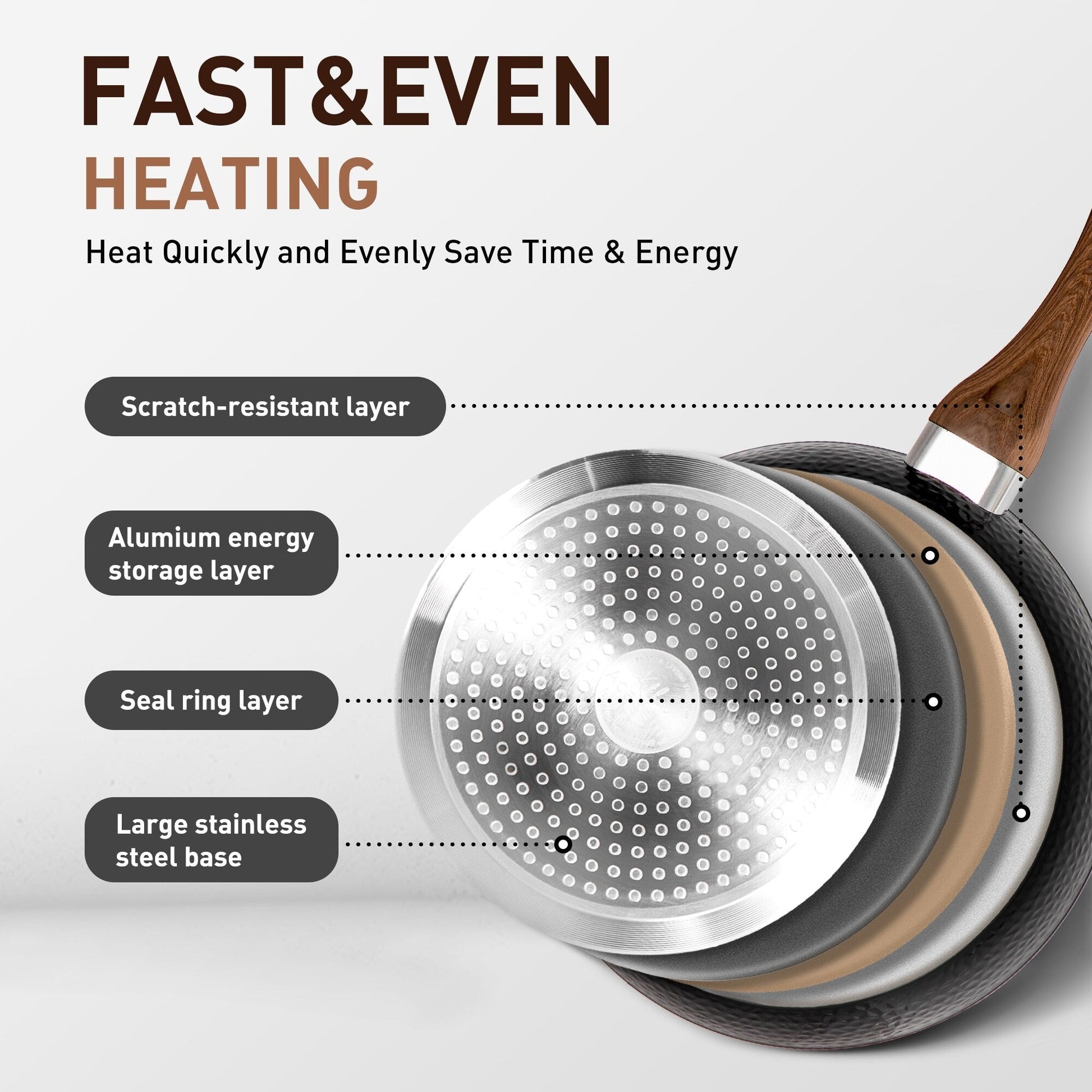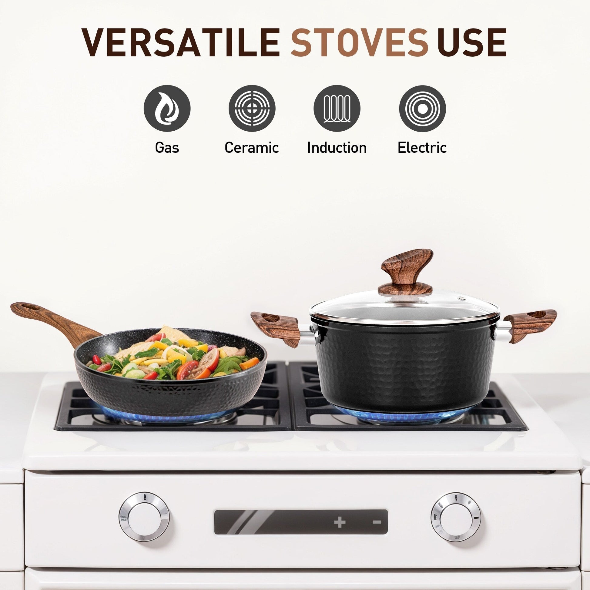 - Set includes 8.15-inch and 9.75-inch fry pans, 1.5qt and 3qt saucepans with lids, 3qt and 5qt casseroles with lids, and 5 nylon utensils