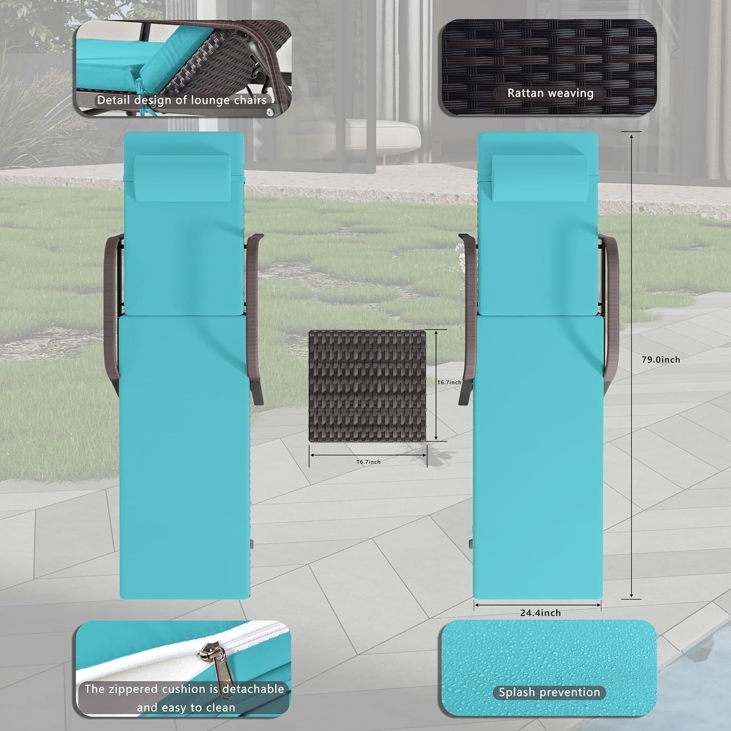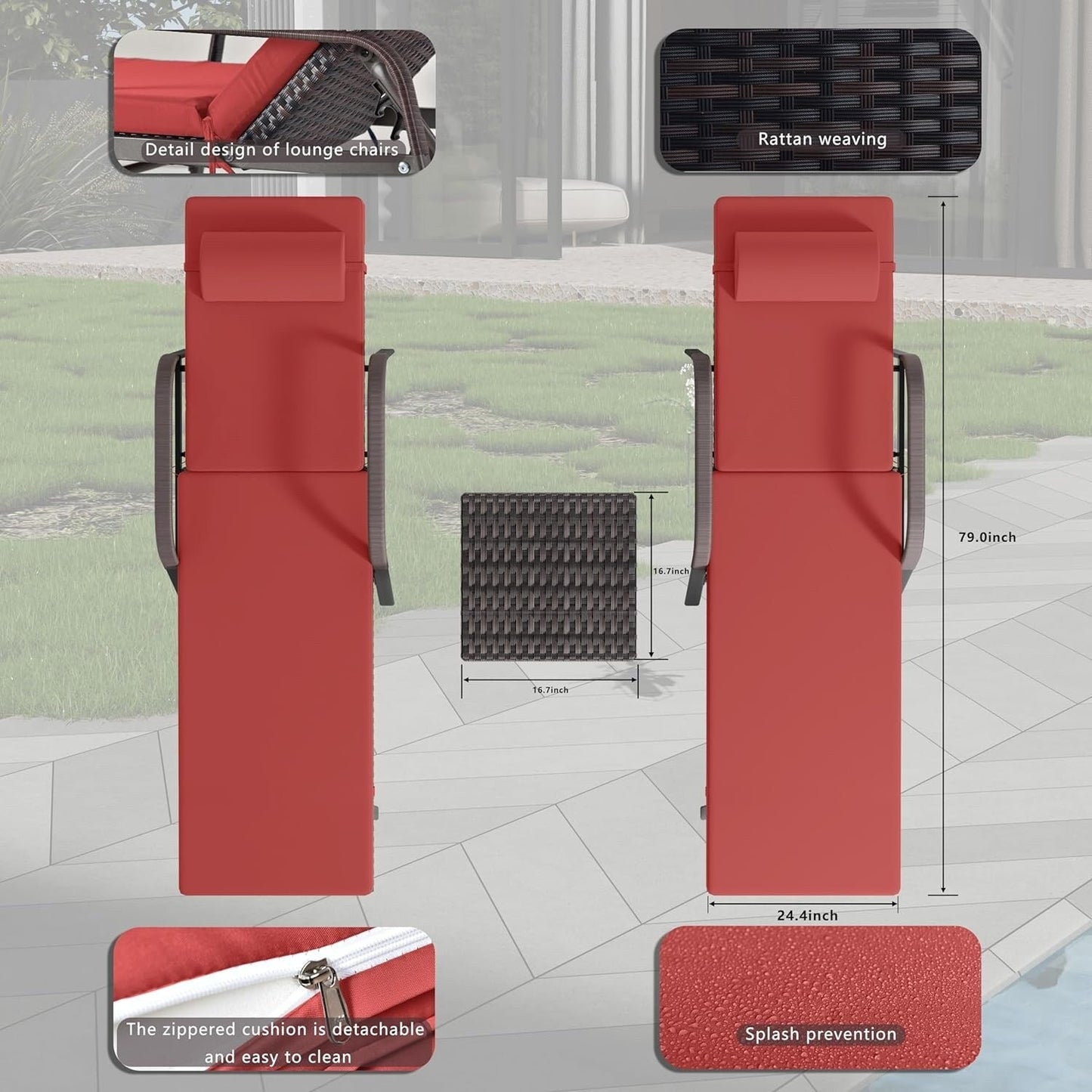 Kullavik patio chaise lounge includes 2 lounge loungers and 1 small wicker table. All three pieces of the set are ready to fold and easy to carry. Using all-weather PE rattan and outdoor rust-resistant metal, this bistro set is premium waterproof as well as sturdy and durable. The cushions of the set are removable and washable. This 3 piece lounge chair set is perfect for patio, garden, poolside.