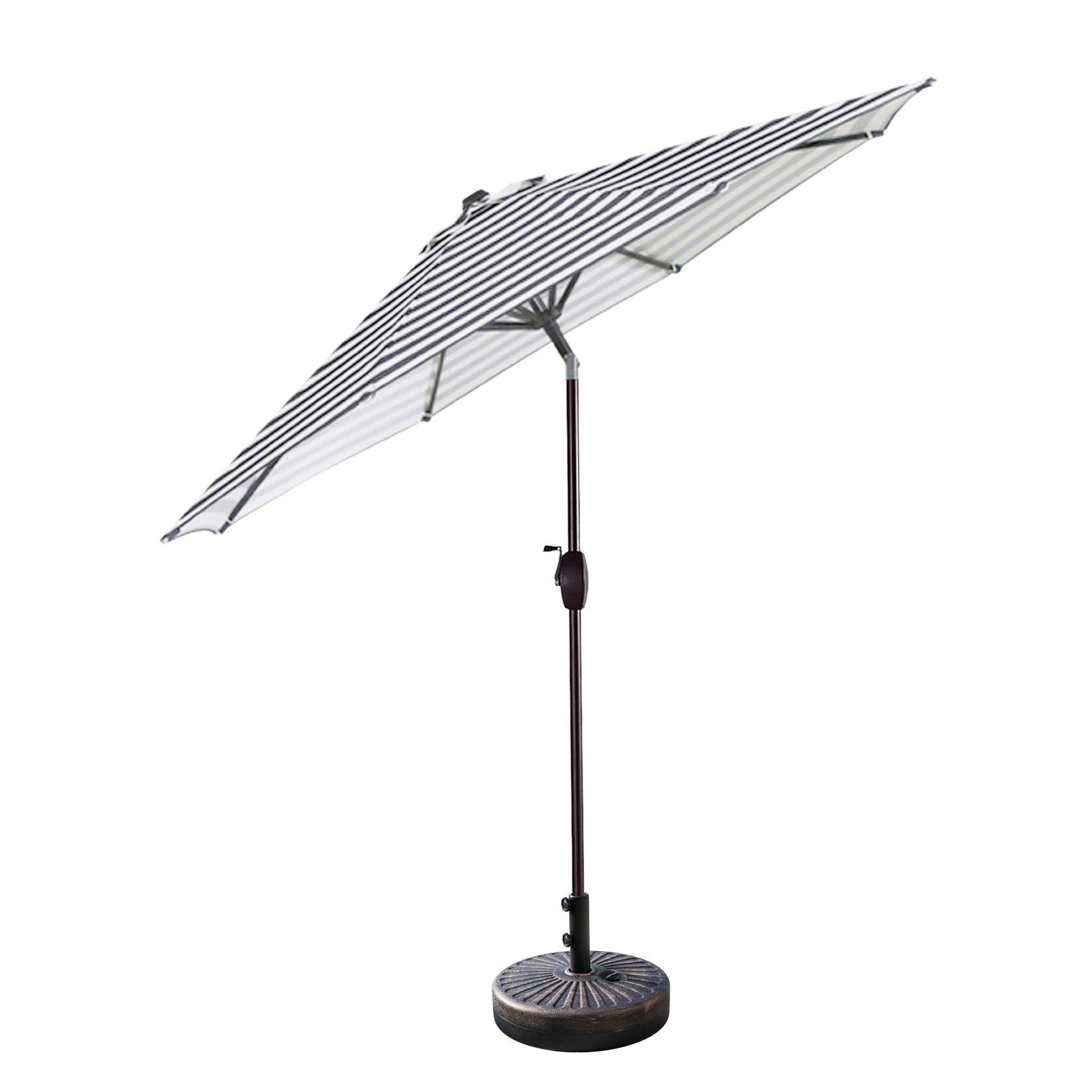 Add some shade to your home with this essential umbrella and base weight set!. Designed with style and durability in mind, this piece is built with an 8 rib steel frame. The polyester fabric blocks up to 95% of UV rays to keep yourself while being fade and water resistant. A push-button tilt mechanism lets you adjust as you please, so you can get just the right amount of sun! The best part is, both are easy to clean and require minimal maintenance!