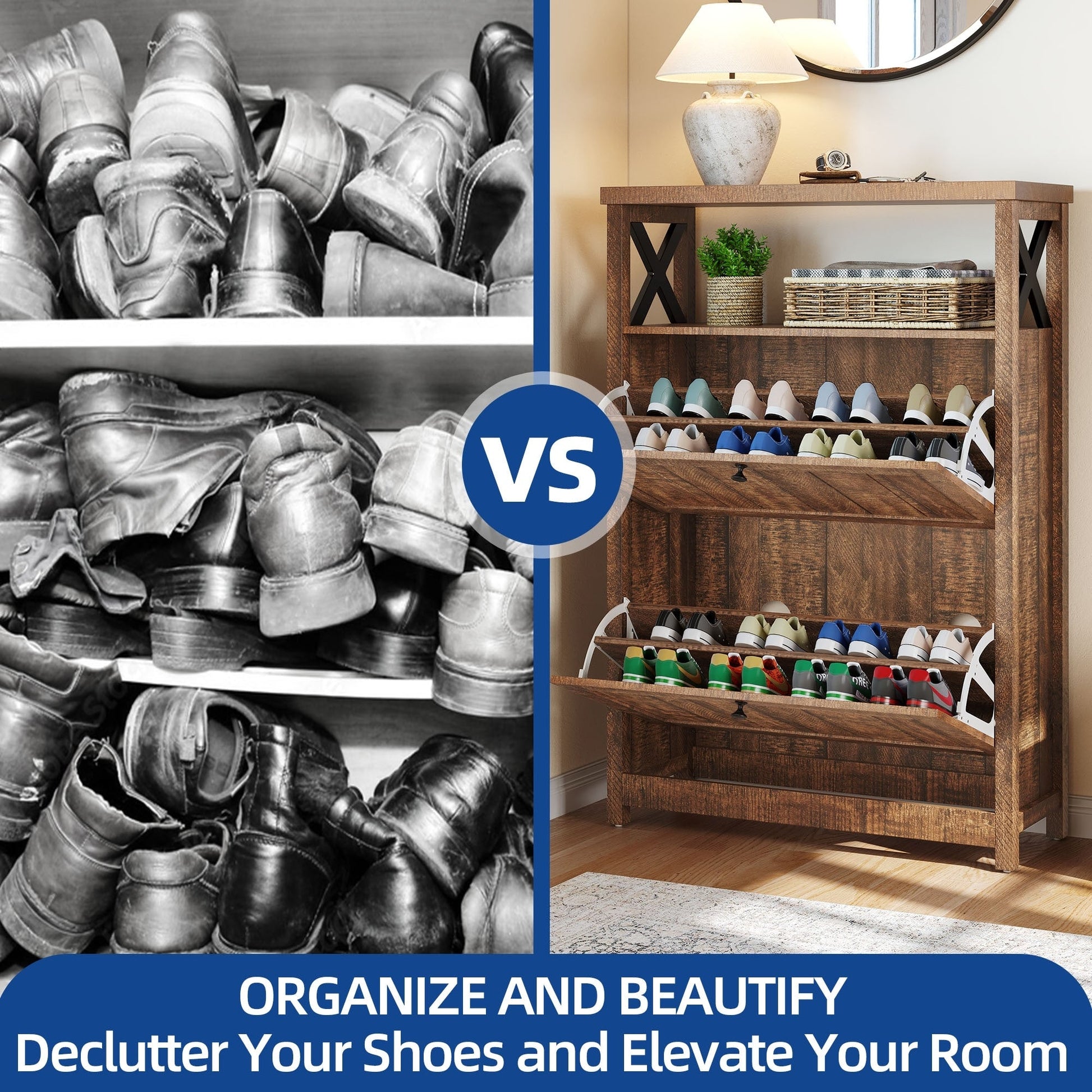 - Flip shoe drawers accommodate 12-16 pairs, protecting them from dust and messiness.