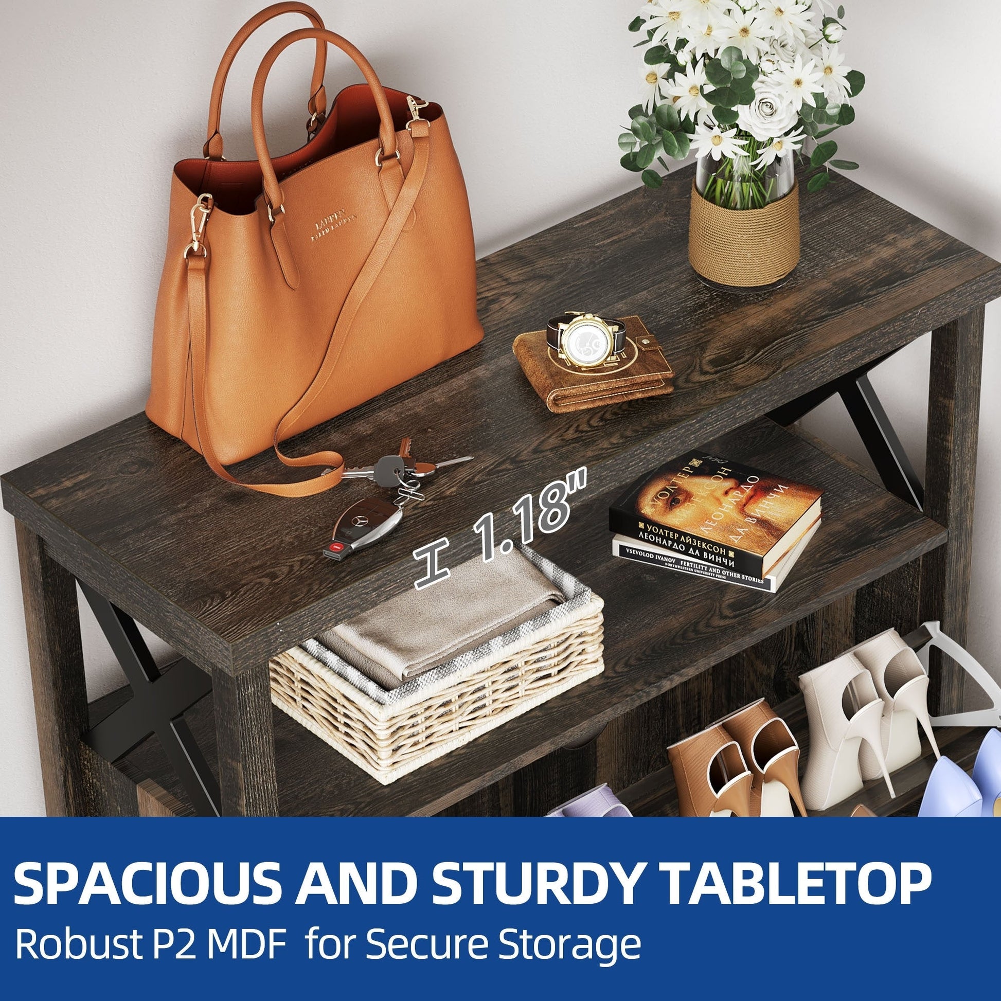- Top storage and open compartment provide easy access to everyday essentials.