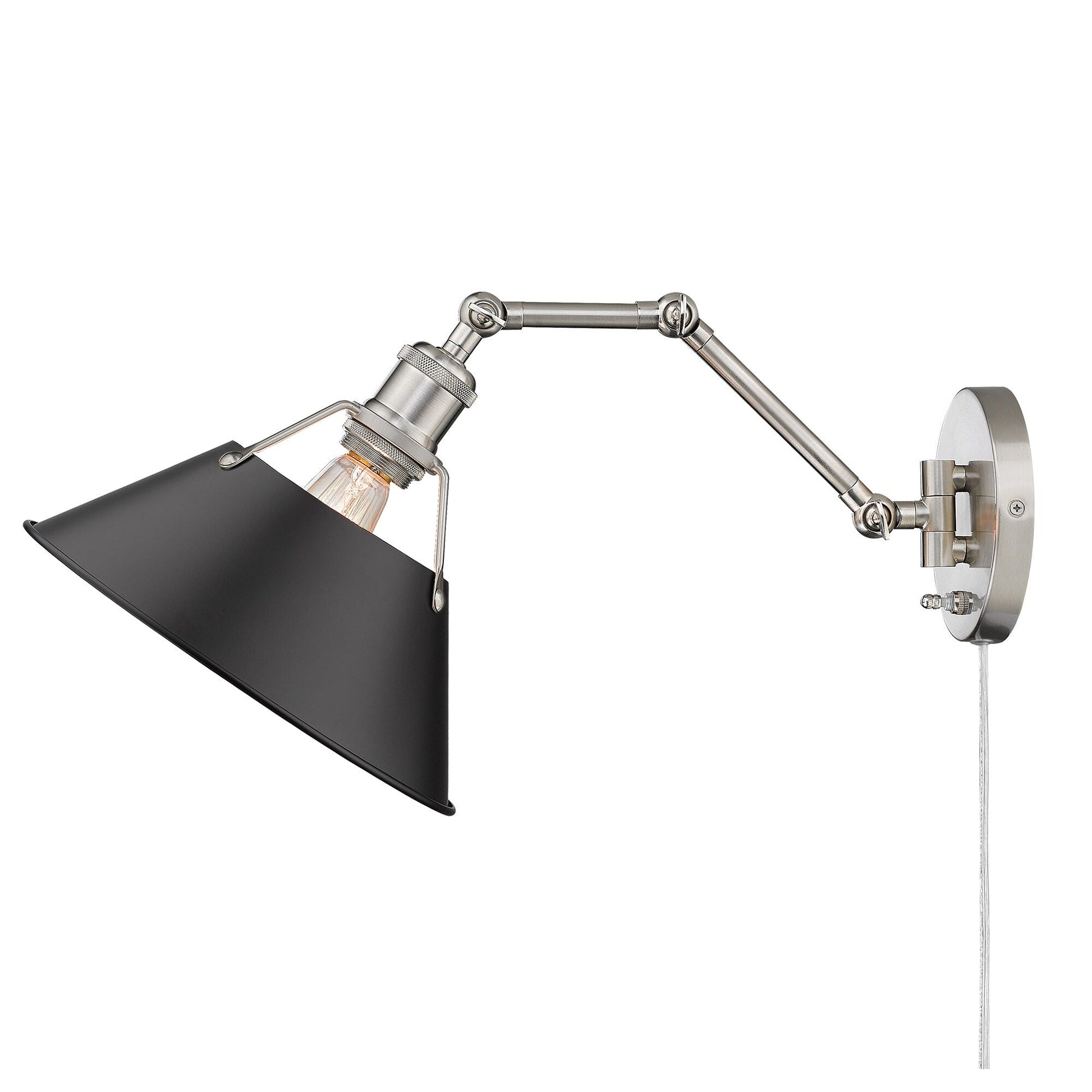 The Orwell AB 1 Light Articulating Wall Sconce is a versatile addition to any room. This industrial-style fixture is part of an extensive collection that shines with refined details. The partial shades protect the eyes from hot spots while the open tops showcase the sockets and bulbs. The design allows light and heat to escape, creating both task and ambient lighting. Complete the vintage look with Edison bulbs. The articulating arm can be conveniently locked in place with thumbscrews for style and function. Choose between plug-in or hardwire installation.