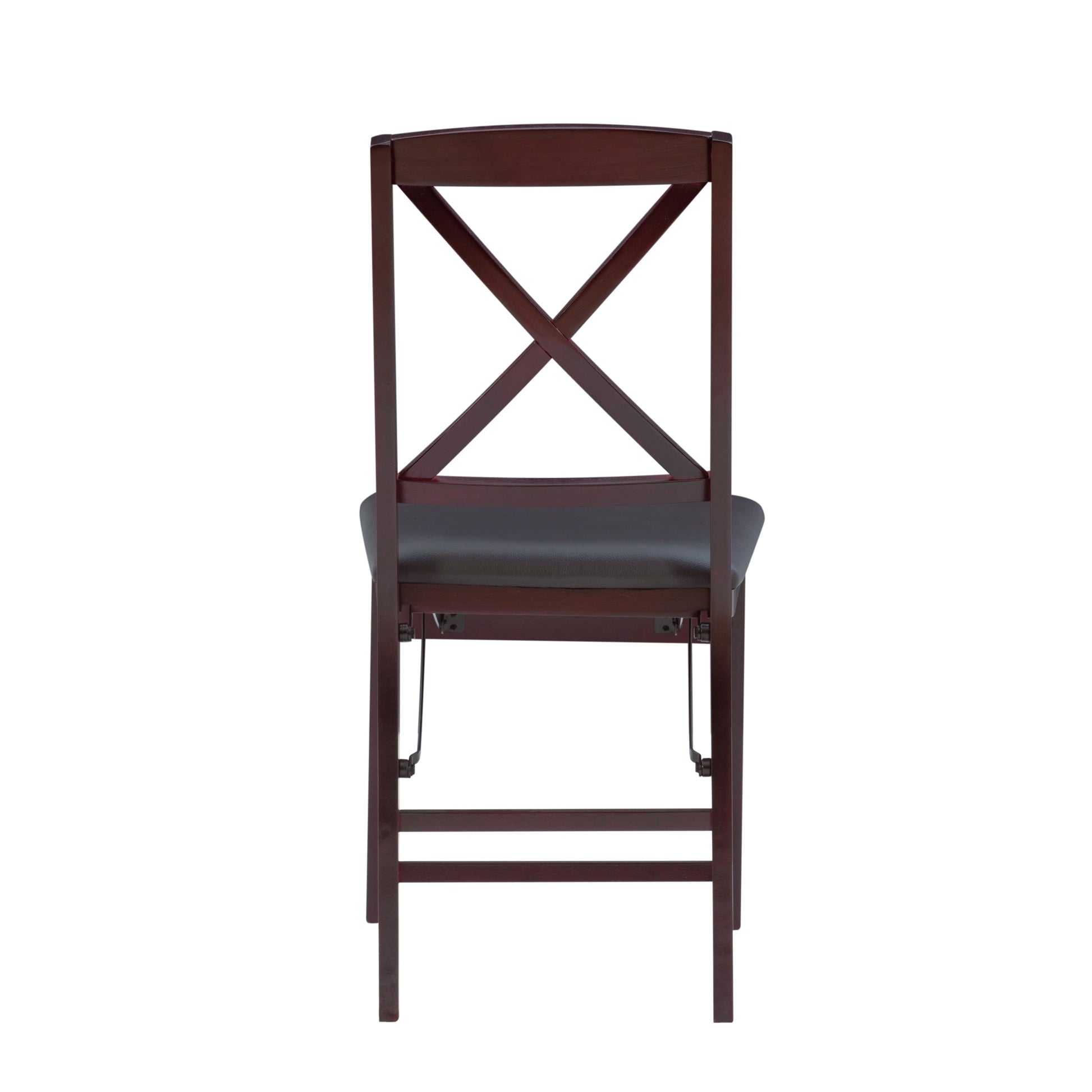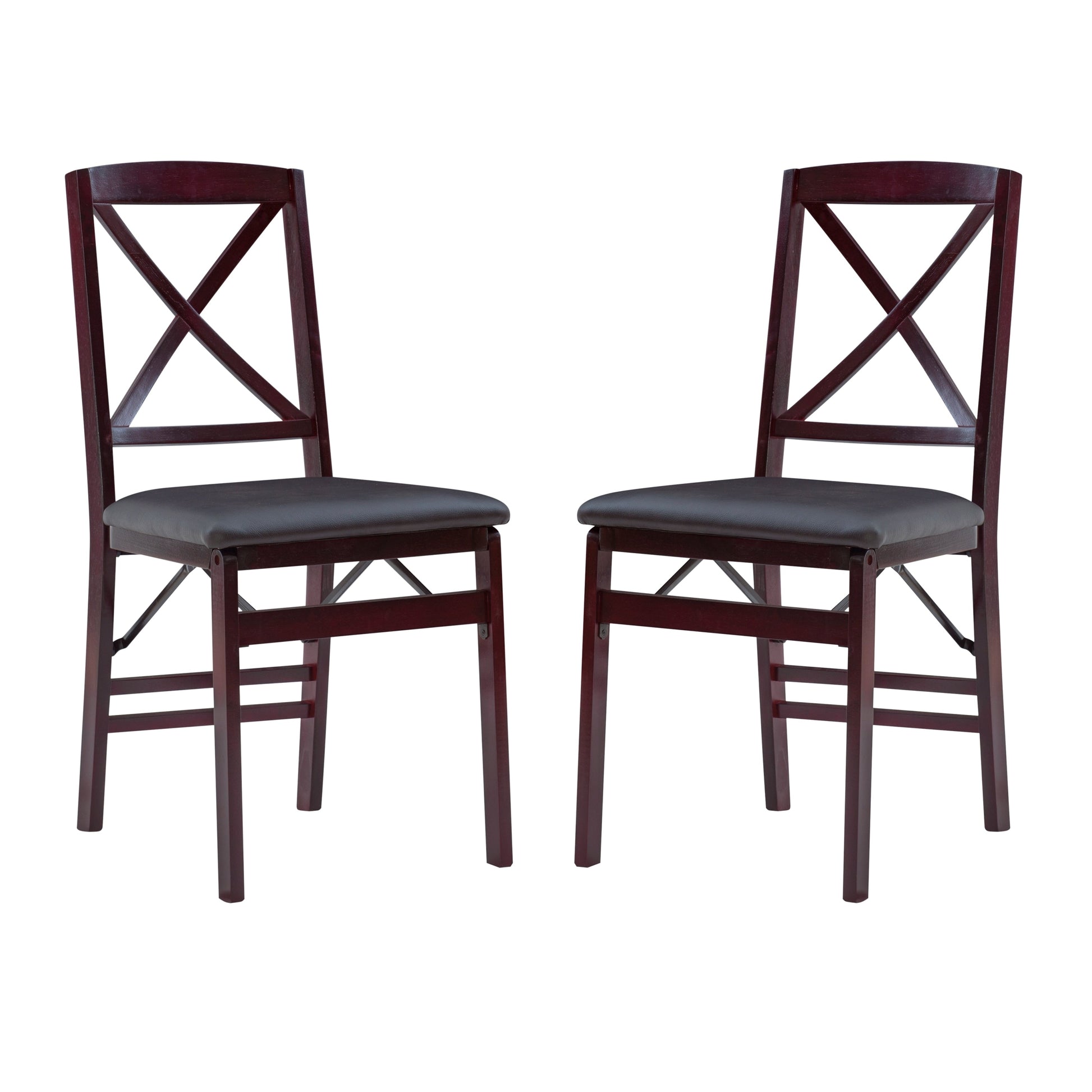 Stylish seating with the convenience of a folding chair. This pair of folding chairs adds an extra dash of elegance for dining or entertaining. The wood frames feature a classic x back and a wipe clean, faux leather padded seat with the appearance of leather, and a rich merlot finish. Front and rear supports provide extra stability. The space saving chairs fold for easy set up and storage. No assembly required.