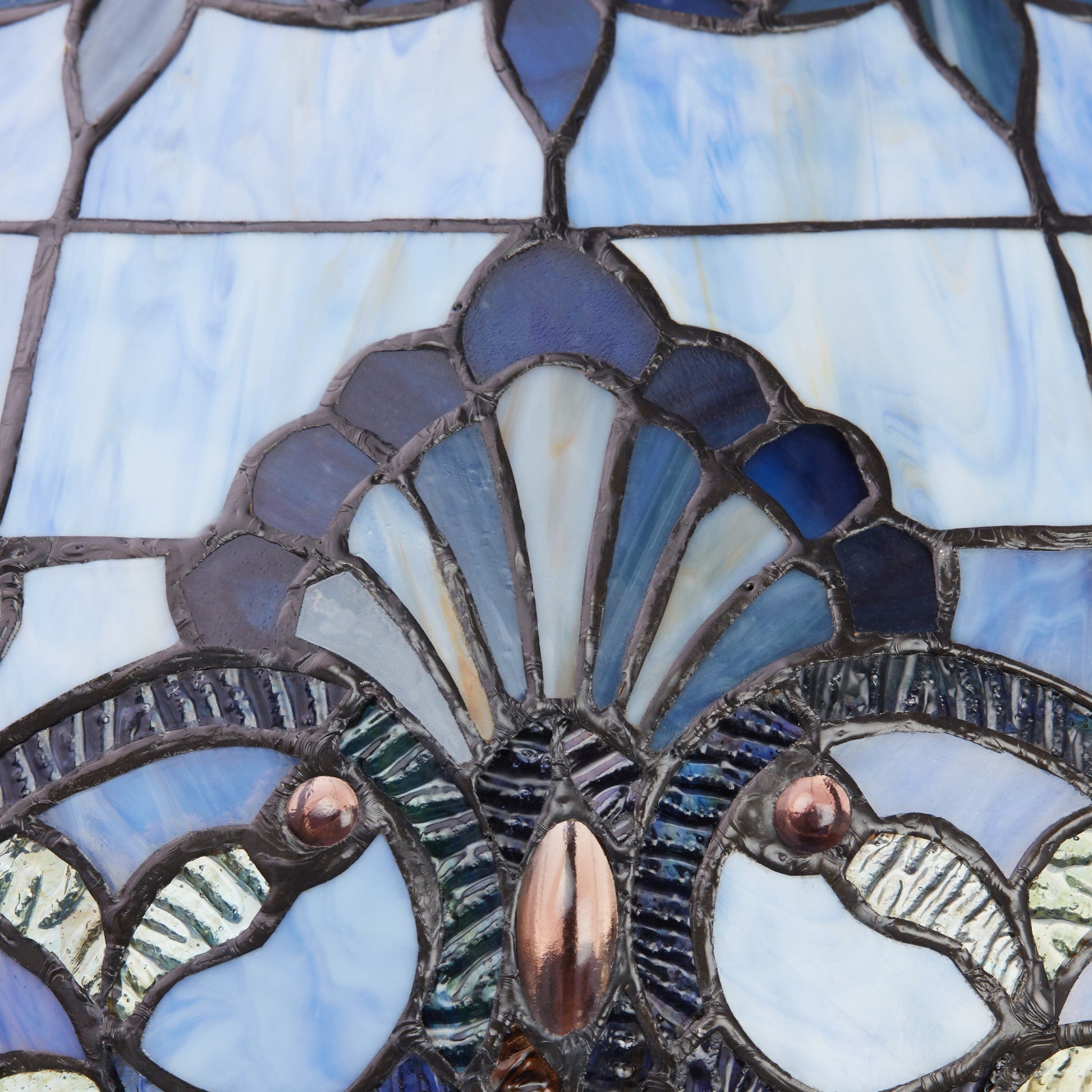 This elegant floor lamp features a traditional stained glass design, making it a versatile addition to your home. The stunning blue glass, metal, and polyresin materials blend seamlessly into any color palette, while the antiqued finish adds a touch of refinement. The candlestick base supports a bowl-shaped shade, crafted from 372 pieces of stained glass and 51 cabochons, casting a cool, ambient light ideal for creating a cozy reading nook or highlighting a focal point in your room.
