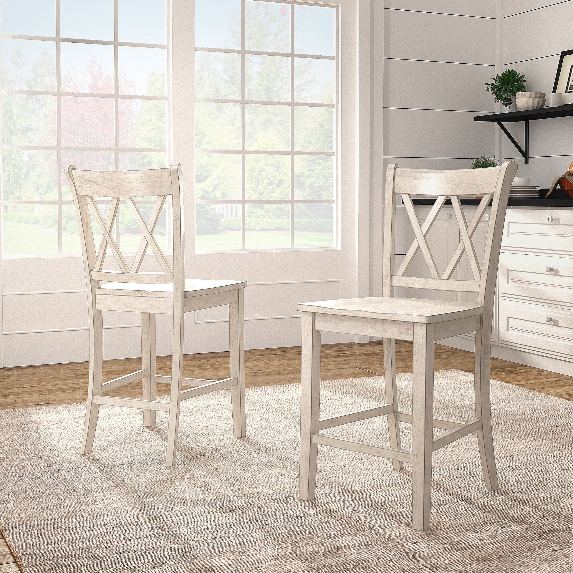 Establish a rustic, farmhouse vibe in your eating area with these Double X-Back Counter Height Chairs (Set of 2). This set of two chairs display a classic, double X-back design that is both supportive and visually appealing. Decorated with a lovely wood grain finish, these chairs complement a variety of settings, both casual and formal. Founded on a sturdy rubberwood frame, these stools are built to last for years to come.
