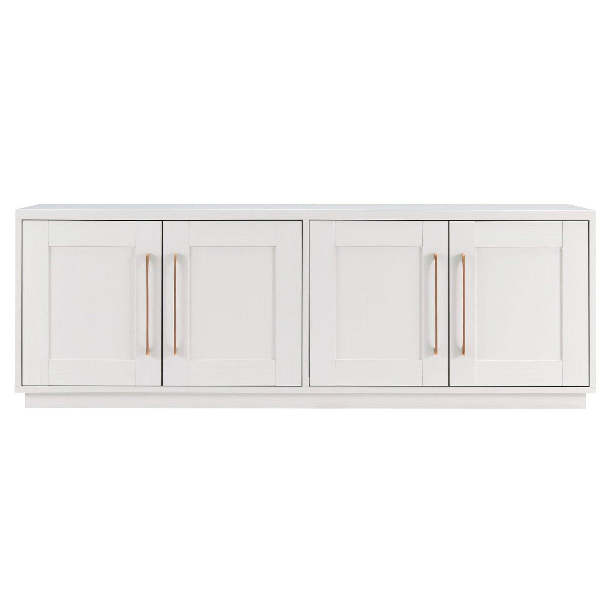 Combine functionality and classic transitional design with this modern TV stand. Its rich wood tone creates a warm neutral palette that will blend seamlessly into any color scheme, while its classic styling pairs perfectly with the existing design inspiration of your living room, den, or game room. This solid-backed stand features two large enclosed cabinets with sleek brass-finished hardware. Cable management cut-outs and adjustable inner shelves help keep your media storage and consoles organized.